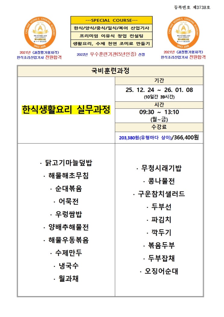 안녕하세요 조해성요리학원입니다 한식생활요리 실무과정 수강생을 모집합니다 12월 24일 ~ 1월 8일 (월~금) 09시 30분 ~ 13시 30분 * 모집인원에 따라 개강이 연기될수도 있음 수강신청바로가기 아래클릭▼ 훈련과정 상세 > 훈련과정 정보 | HRD-Net - 고용24 맛있는 생활요리를 배우고 싶으신 분들은 학원을 연락주세요 043-236-5602 <img src="https://blogthumb.pstatic.net/MjAyNTEyMTdfMTIx/MDAxNzY1OTUzMTk1NTYz._Xb6KELcg8u3oNB-1X_dZ69foqaukFVRHTowifghYPgg.UuiiNIvhseGEBxFSsM90OqBTR5WgjSXy0EIaakuXn5kg.JPEG/%C7%D1%BD%C4%BB%FD%C8%B0%BF%E4%B8%AE_%BD%C7%B9%AB%B0%FA%C1%A4001.jpg?type=s3" />