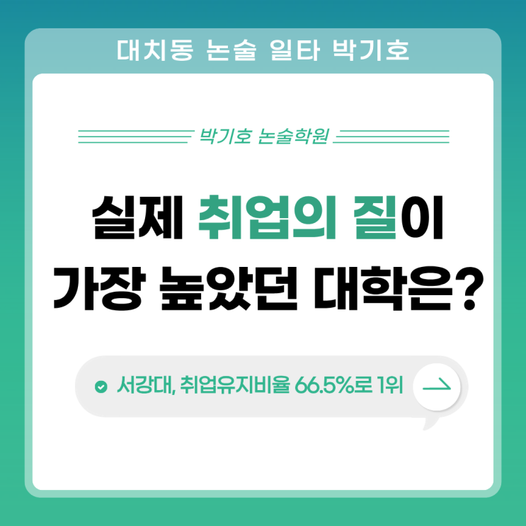 안녕하세요. 박기호 논술학원입니다. 실제 취업의 질이 가장 높았던 대학은 어디였을까요? 대학 진학을 고민할 때 많은 분들이 가장 먼저 확인하는 지표는 ‘취업률’입니다. 하지만 단순히 취업을 했는지보다 더 중요한 질문이 있습니다. “그 취업은 얼마나 오래, 얼마나 안정적으로 유지되었을까?” 이 질문에 답하기 위해 최근 주목받고 있는 지표가 바로 ‘취업유지비율’입니다. 취업유지비율은 취업률 × 4차 유지취업률로 계산되며, 단기·형식적 취업이 아닌 실제 취업의 질과 지속성을 함께 반영하는 지표입니다. 2024년 기준, 취업유지비율 1위는 서강대 2024년 기준 상위 15개 주요 대학의 취업유지비율을 살펴본 결과, 서강대학....... <img src="https://blogthumb.pstatic.net/MjAyNjAyMDZfMjIz/MDAxNzcwMzY3MzI1NDYx.gv7rp6v3lN7gLsrRIY5OOstJ1dXSN3t5S-7pzPa_WtQg.LVJWj3nX8Ii7CN-9VwjBq9USkv-LGGPuNr9dTMNgAcEg.PNG/%C1%A6%B8%F1%C0%BB_%C0%D4%B7%C2%C7%D8%C1%D6%BC%BC%BF%E4._%287%29.png?type=s3" />