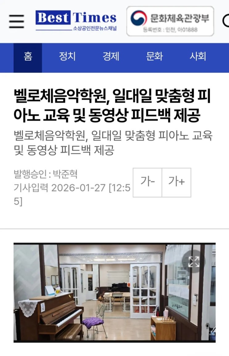 가경동 피아노 벨로체 음악학원 안녕하세요! 올 해 감사하게도 청주시 우수학원으로 선정되어 언론사 인터뷰를 진행하게 되었습니다. 학부모님들의 성원에 감사드리며 앞으로도 아이들과 함께 즐거운 음악 여정을 통해 행복한 추억 만들어 가겠습니다. #벨로체음악학원 #가경동피아노 #가경동음악학원 <img src="https://blogthumb.pstatic.net/MjAyNjAyMDZfMjc3/MDAxNzcwMzc3MjY3ODIw.InUpfYmBdGcAz6QAZ6QmmAxeOHu5N1Y-ToaPLj6fzJsg.E9iikE3uVvDTyY-KmC2y0Q79U6u6KLtw8R-Q7XmCn0Ig.JPEG/900%A3%DFScreenshot%A3%DF20260203%A3%DF195328%A3%DFNAVER.jpg?type=s3" />