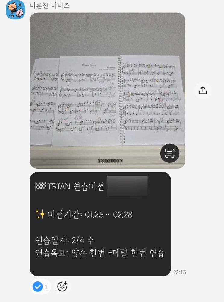 안녕하세요. 트리안음악학원입니다.️ 1월말부터 시작 된 성인클래스 연습챌린지가 수강생분들의 열정으로 순조롭게 진행되고 있습니다. 주말, 퇴근 후, 늦은 밤에도 연습하시는 인증사진 공유합니다 35일간, 꾸준히 이어가는 연습 ✨미션기간 : 01.25 - 02.28 연습미션 안내 1) 주 3회이상 연습 - 5주동안 총 15번 연습챌린지 - 원내•가정연습, 레슨일 연습횟수로 인정 2) 인증사진과 연습기록지 전송 - 피아노&악보 인증사진 카톡으로 전송 - 연습일자와 간단한 연습목표 기록 챌린지 성공시 - 15번 성공시 7,000원 할인 + 네이버리뷰 등록시 추가 3,000원 할인 주 5회 연습하시는 수강생분의 열정에 박....... <img src="https://blogthumb.pstatic.net/MjAyNjAyMDVfMTU5/MDAxNzcwMjU3MzA4NTU1.g7V4vT9pWVGDVsOhRomU_jeP8FAKrbmFllXSRAZpMucg.UZUFrTTYUcMYs0H7XvS7rXHDR-_vp6QbZiHpZWlHt50g.JPEG/output%A3%DF1709123988.jpg?type=s3" />