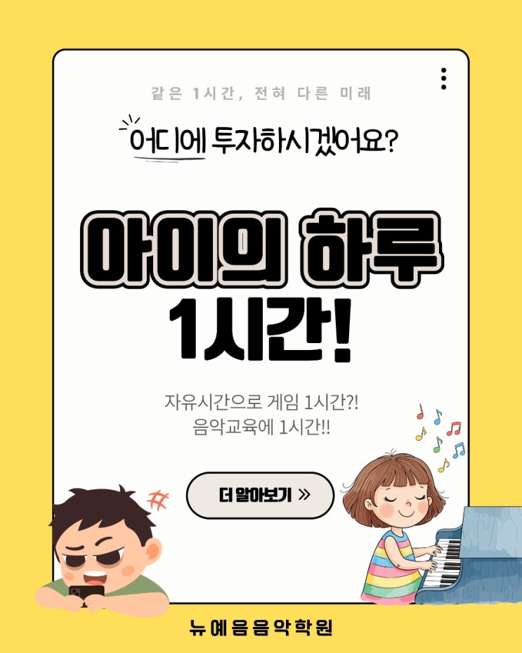 하루에 핸드폰 게임 1시간, 음악교육 1시간. 같은 1시간이지만 결과는 전혀 다릅니다. 아이들은 하루에도 수많은 선택을 하며 시간을 보냅니다. ✅️ 그중 부모가 대신 선택해줄 수 있는 가장 중요한 것이 바로 ‘아이의 몰입 시간’입니다. 게임 속 1시간은 빠른 자극과 즉각적인 보상을 줍니다. 하지만 그 시간은 대부분 기다림 없이 얻는 결과, 생각하지 않아도 되는 흐름, 끝나면 남지 않는 피로로 마무리됩니다. 반면 음악교육의 1시간은 다릅니다. 악보를 읽으며 집중하고, 리듬을 계산하며 사고하고, 양손을 조율하며 스스로를 통제합니다. 한 곡을 완성하기까지 아이들은 자연스럽게 배우게 됩니다. 포기하지 않는 법 실수 후....... <img src="https://blogthumb.pstatic.net/MjAyNTEyMjZfMjM2/MDAxNzY2NzUwMzk2NzU0.4qOs92IrL_hof2crG1zZscc031aBT_yOKp6cTVAmxEUg.xrEI9Zb-xXhgDdeOiKJQIdCzdN79WXVBGbv5armvZAsg.JPEG/900%A3%DF1766750295742.jpg?type=s3" />