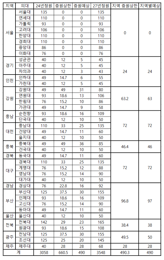 1.2027년 의대 모집인원 : 3058명에서 490명 늘린 3548명 2.2027 수시 모집요강 일정 : 4월에 배정은 완료되고, 대교협이 5월 공고 3. 50명 미민 소규모 대학은 2024년 정원대비 100%까지 늘릴 수 있고, 50명 이상의 경우에는 2024년 대비 중원율이 30%를 넘지 않아야 한다. 그럼 여기에서 ◆ 2027년 충남 의대 정원 변화를 정리해 봅시다. 1. 한눈에 보는 변화 핵심 2024 → 2027 : 총 332명 → 404명 +72명 증가 (약 +22%) 지방 의대 중심 확대 정책 (지역의사제 도입) 2. 충남 지역 의대별 정원 변화 ▶ 2027학년도 기준 (대전·충남 5개 의대) ▶ 총 증가: 72명 3. 시각적으로 보는 정원 증가 충남대, 순천향대 → 대형 의대화 단국대(천안) →....... <img src="https://blogthumb.pstatic.net/MjAyNjAzMjZfMjI5/MDAxNzc0NTA3NDk2MTI1.pqME4dwd2WdlhcEiUjS_pfbPXPNIUzYf56dUi7vOeR0g.3svySXP5ojZCo8-De5iMUgB17-0lDj1gAPT40BpSlgQg.PNG/%C1%A6%B8%F1_%BE%F8%C0%BD.png?type=s3" />
