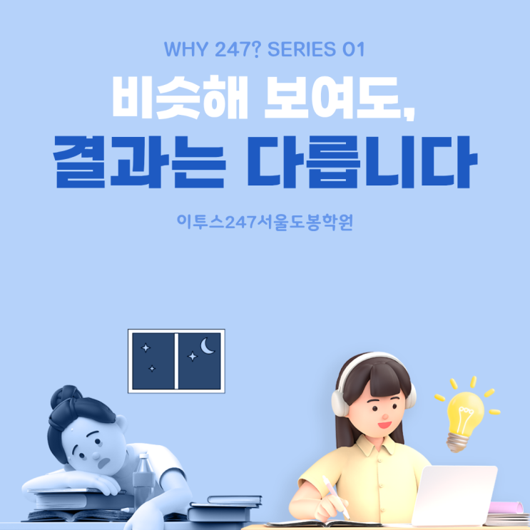 안녕하세요 이투스247서울도봉학원입니다. 상담을 진행하다 보면 가장 많이 듣는 말이 하나 있습니다. “공부는 열심히 하고 있는데, 왜 성적이 안 오를까요?” 실제로 많은 학생들이 하루 종일 책상에 앉아 있고, 독서실·학원 등 공부 환경도 갖추고 있지만 원하는 결과까지는 쉽게 이어지지 않습니다. 그 이유는 단순합니다. 공부 환경이 아니라, 관리 방식의 차이 때문입니다. 공부 환경은 비슷해 보여도, 결과는 다를 수밖에 없습니다. 겉으로 보면 독서실, 스터디카페, 관리형 학원 모두 “공부하는 공간”이라는 점에서는 비슷해 보입니다. 하지만 실제로는 큰 차이가 있습니다. ✔ 독서실형 학습 관리 없이 혼자 공부하는 구조 흐트....... <img src="https://blogthumb.pstatic.net/MjAyNjAxMTFfMTI2/MDAxNzY4MTE1NDM1MjE3.g80YJQnsb33u-d9Rebi744SLtTXg-_JnpbUgvQxiZx0g.1mXgivkdU0ItigIDE5Q0ARuTCZ8oNqPs_8L8gLPLj1Qg.PNG/1.png?type=s3" />
