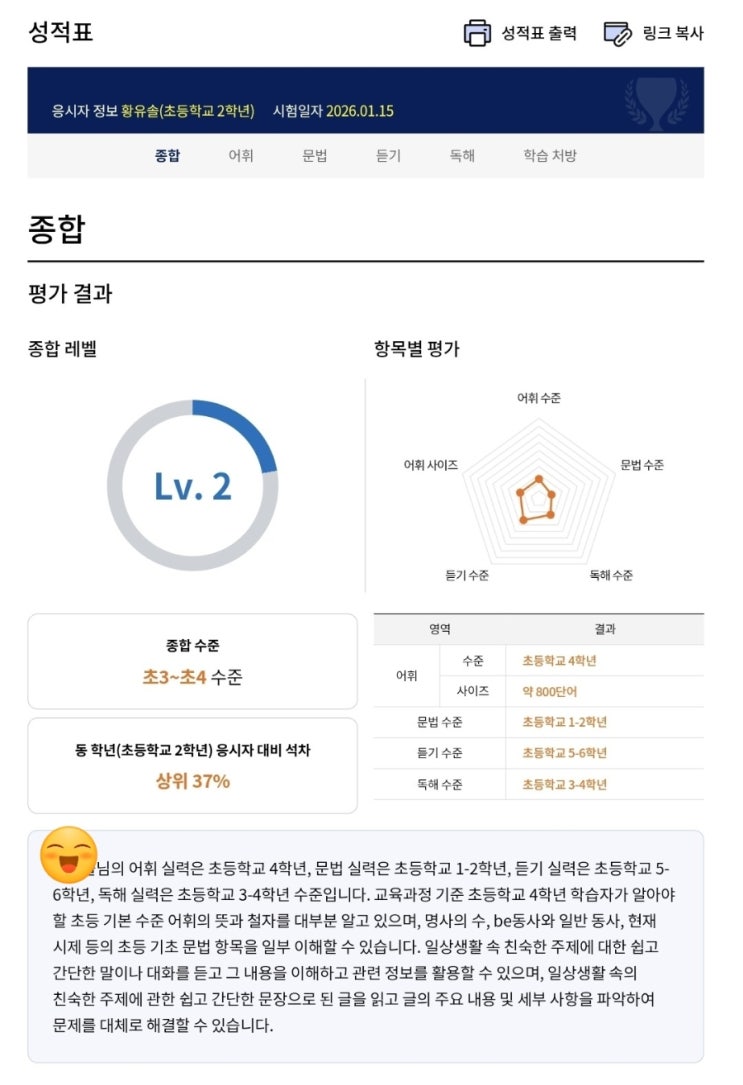 안녕하세요. ^^ 도봉구 쌍문동 백운초 앞 영어학원 영어독서교실 원장 고심하는서쌤입니다. 오늘은 초등학교 2학년 여학생의 점수를 가지고 왔습니다. 우리 영어독서교실에서 공부한 지 딱 1년 된 친구입니다. 워낙 야무지고 영민한 아이라 조금 기대를 했는데요. 역시나 좋은 점수가 나왔습니다. ^^ 어휘는 초등학교 4학년 수준으로 상위 27%, 문법은 초등학교 1-2학년 수준으로 상위 69%, 듣기는 초등학교 5-6학년 수준으로 상위 25%, 독해는 초등학교 3-4학년 수준으로 상위 21% 나왔습니다. 어휘, 듣기, 독해는 상당히 좋은 점수가 나왔는데, 문법을 아직 공부하지 않았기 때문에 문법 점수가 잘 나오지 않았네요. 넬트는 정확히 나의 실력을....... <img src="https://blogthumb.pstatic.net/MjAyNjAxMTVfMTUz/MDAxNzY4NDgyOTg4MzU4.iXy-89wr6RYDQ77q4ALbE5_Q7s5I18ilFmcRxmPLzx4g.vdOJa4I1r5w3mgo3jcmiEfzTKzaJwveLkTNb2ua-qasg.JPEG/900%A3%DF1768482987708.jpg?type=s3" />