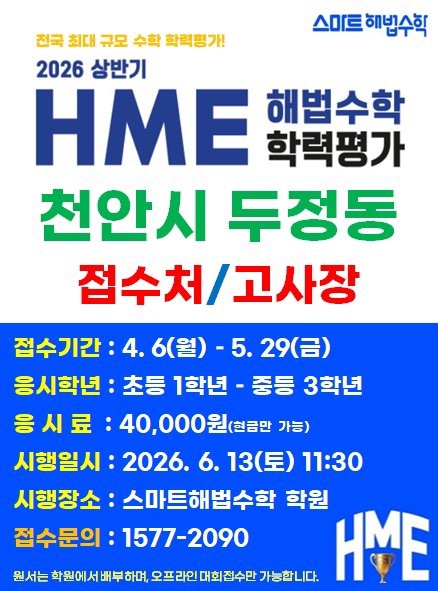 2026 상반기 HME 해법수학 학력평가 접수 안내 안녕하세요, 윤정학원입니다 스마트해법수학에서 주관하는 2026 상반기 HME 해법수학 학력평가 접수가 시작되었습니다! 천안 / 아산 / 서산 / 당진 / 예산 / 홍성 지역 학생 및 학부모님들께 안내드립니다. HME 해법수학 학력평가란? 전국 241만 명 이상이 응시한 국내 최대 규모의 수학 학력평가로, 교과 과정을 기반으로 학생들의 수학 실력을 객관적으로 점검할 수 있는 시험입니다. ✔ 현재 수학 성취도 정확히 파악 ✔ 개념 이해도 및 기본기 점검 ✔ 전국 단위 비교를 통한 위치 확인 ✨ HME를 꼭 봐야 하는 이유 ✔ 학생의 개념 이해도 및 원리 파악 능력 점검 ✔ 취약....... <img src="https://blogthumb.pstatic.net/MjAyNjA0MDVfMjM3/MDAxNzc1MzY5NjQ2NTk1.0sIFNptay9OBywcHDTpX4oMIh_phyKYqjhTz1BbCb1Mg.FnzqfgTeXiSLWGdWzJvOeuSwjd4UWPks7f2toYr7hgQg.JPEG/BandPhoto%A3%DF2026%A3%DF04%A3%DF03%A3%DF09%A3%DF15%A3%DF18.jpg?type=s3" />