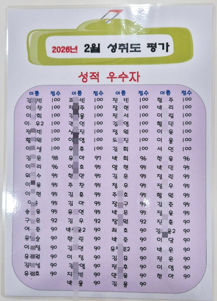 안녕하세요^^ 신불당 수학학원 소수정예 개별진도 대치힘수학 불당학원입니다. 2월에도 변함없이 한 달 동안 배운 내용 휘발되지는 않았는지 꼼꼼하게 체크하기 위해 성취도평가를 실시하였습니다! 결과가 90점 이상인 친구들은 포인트를 주고 문화상품권으로 바꿀 수 있도록 합니다. 휘발되거나 취약한 부분을 보인 친구들은 클리닉 수업을 통해 한 번 더 구멍을 메꿔주는 아주 소중한 시간! 이미 성취도평가 파일은 가정으로 보내 아이의 성적과 현 학습 과정을 부모님들과 공유하였습니다. 가정에서도 아이들에게 무한 칭찬과 따뜻한 격려 부탁드립니다^^ 한 반 정원 5명, 아이 역량에 맞는 개별 진도 수학 수업! 꼼꼼한 관리로 보다 나은 결....... <img src="https://blogthumb.pstatic.net/MjAyNjAzMDZfMTg0/MDAxNzcyNzg1MjU0ODI4.fhyAe8IjZm8_QCYgqkJWgf4jqeFgqIPN8xjk5wqx4iMg.qrlsj2p3QMRLpwyCAWkPXvqriMa1SzT-LaoNoZ-n0N0g.JPEG/%BC%BA%C3%EB%B5%B5%C6%F2%B0%A12%BF%F9_%BA%ED%B7%CE%B1%D7.jpg?type=s3" />