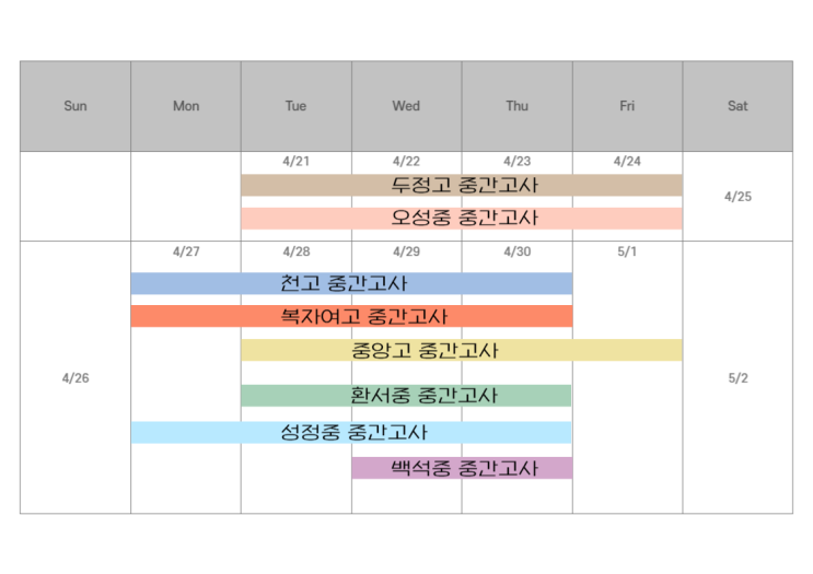 안녕하세요 키쌤입니다. 새학기가 시작되었지만 눈도 오고, 아직은 날이 춥네요. 그렇지만 곧 날도 따뜻해지고 시험기간도 다가오겠죠? 1학기 학교별 시험일정 정리했으니 필요하신 분들 참고하시면 됩니다. 이번 1학기 시험기간은 비교적 2주로 짧게 몰려있어 너무 다행이에요. 작년 시험 보는기간만 4주였던걸 생각하면... 모든 학생들과 선생님 올해 시험기간도 화이팅 합시다! 키쌤영어 상담문의는 010-7521-3150 으로 문자 남겨주세요. 감사합니다. <img src="https://blogthumb.pstatic.net/MjAyNjAzMDZfNyAg/MDAxNzcyNzgwMDc3NTE1.IUk0x0TMehdSv5EzXBpIJqdBT2GmgaT8Dgnz15yVFlog.TtMsK8Rf9SdPcvK-8tOF1JNFnt5Yds1ygS71H67iEBkg.PNG/002.png?type=s3" />