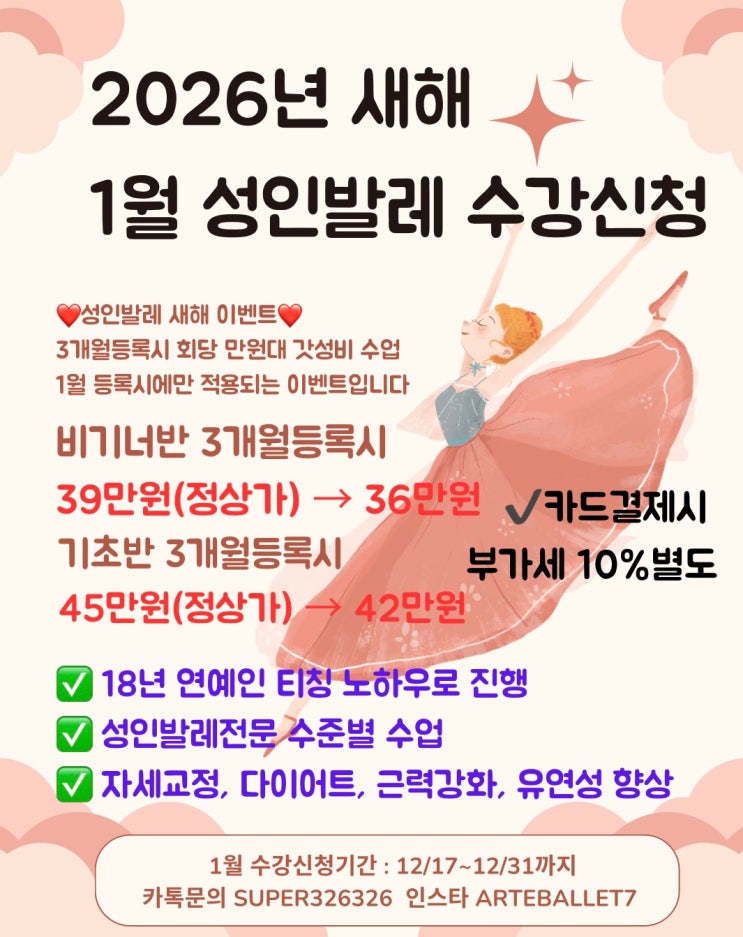 안녕하세요^^ 성인발레전문 아르떼발레 입니다~~ 벌써 올해도 2주밖에 남지 않아요ㅠㅠ 시간이 빨리 가니 아쉬움 반 새해가 곧 다가오니 기쁨 반 이네요~ 올해도 아르떼발레를 사랑해주신 많은 성인발레 회원님들 정말 감사드립니다 내년에도 발레로 건강한자세와 바른몸을 만들어 삶의질을 높여드리는데 최선을 다하겠습니다~!! 그래서~~!!! 2026년 새해 맞이 이벤트를 준비했지요^^ 1년에 손에 꼽히는 아르떼 이벤트~~!!! 2026년 새해에 자세교정에 좋은 성인발레 배워서 바른자세,바른멘탈로 새해를 시작하세요^^ 내년에 결혼하는 티파니영도 발레 한데요~~~ 지금도 늦지 않아쒀요~~~^^ < 2026년 1월 성인취미발레 수강신청 > ▶ 오 전....... <img src="https://blogthumb.pstatic.net/MjAyNTEyMTdfMjkx/MDAxNzY1OTQ5NzQ4NTUx.tySHv62KQGgNQ1VtrJ62MGzxtNIChQO51ghcRG-Rucog._8rIPop39gXRwcPKC42aV2AizSmj5u2hye8f8QX8aYMg.JPEG/1%BF%F9_%BC%F6%B0%AD%BD%C5%C3%BB.jpeg?type=s3" />