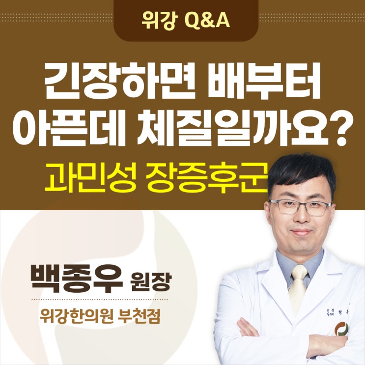 Q. 평소에는 괜찮은데 긴장하거나 스트레스를 받으면 배부터 아파요. 중요한 약속이나 시험, 회의 같은 일이 있으면 배가 꼬이듯 아프고, 화장실을 자주 가게 되거나 설사를 하기도 해요. 반대로 어떤 날은 며칠씩 변비가 생기기도 하고, 배에 가스가 차서 더부룩하거든요? 병원 검사에서는 특별한 이상이 없다고 하는데, 증상은 반복되다 보니 혹시 체질적인 문제는 아닐지 걱정이 됩니다. A 안녕하세요? 위강한의원 부천점 백종우 원장입니다. 긴장하면 배부터 아프고, 스트레스 상황에서 장 증상이 먼저 나타나는 경우는 과민성 장증후군의 전형적인 양상 중 하나입니다. 과민성 장증후군은 검사상 뚜렷한 염증이나 구조적 이상은 없지만, 장....... <img src="https://blogthumb.pstatic.net/MjAyNjAxMDdfMTYw/MDAxNzY3NzgzNDgyOTQ0.mlJIIz940KEhD0r_H0lbRJCuLQrSGFCqR4wNvHPx28gg.1aHsAE0JkohcFj8qZyWpJB3KzQK6zlHGvXmB7HY9W4Eg.JPEG/%B1%E4%C0%E5%C7%DF%C0%BB%B6%A7%BA%B9%C5%EB.jpg?type=s3" />