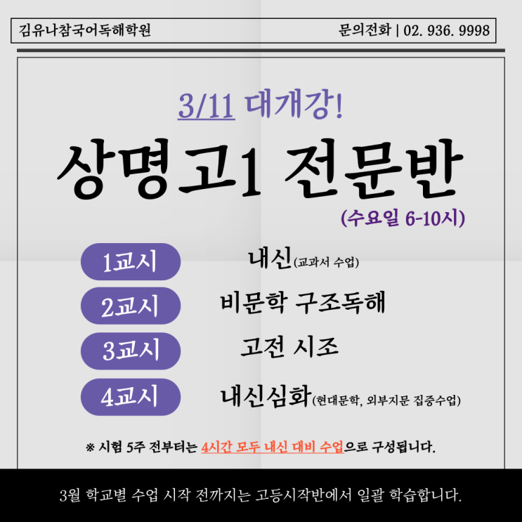 안녕하세요 김유나학원입니다:) 곧 안내드릴 올해 고1 시간표 이전에 상명고1 개강반에 대해 먼저 말씀을 드리려고 합니다. 작년부터 늘 상명고 내신반에 대한 문의가 많았는데, 늘 여러가지를 고려하다 보니 어머님들께 죄송한 거절의 말씀을 많이 드렸는데요 (ㅠ_ㅠ) 올해는 열화와 같은 성원에 힘입어, 상명고1 전문반을 개강하게 되었습니다!!!! 시간표는 위와 같습니다. 3월 11일 전까지는 현재 예비고1 재원생 친구들과 같이 고등시작반에서 수업을 듣게 됩니다. 3/11일부터 개강하는 상명고 반은 내신기간 5주(때에 따라 6주까지)를 제외한 나머지 기간을 모의고사/독해 공부에 힘쓰게 됩니다. '상명고' 라는 학교의 특성상, 내....... <img src="https://blogthumb.pstatic.net/MjAyNjAxMDlfMTU4/MDAxNzY3OTQ0MjEzODI3.5undp0Rv2xde-YgwZcEjDywlcL8JFNIxzHTFgjovdrUg.lBjfPQRkAeieqc4g0U5Kden3yZTLRWQzZRquqkGMLiwg.PNG/%C1%A6%B8%F1%C0%BB-%C0%D4%B7%C2%C7%D8%C1%D6%BC%BC%BF%E4_-001.png?type=s3" />