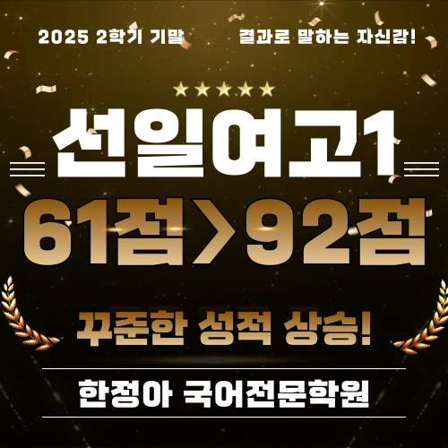 안녕하세요. 결과로 증명하는 실력. 은평구 선일여고 국어 내신 전문학원, 한정아국어입니다. 이번 선일여고 1학년 국어 기말고사에서 좋은 소식이 있어 여러분에게도 알려드리고자 합니다! 저희 한정아국어 재원생이 이번 시험에서도 의미 있는 성적 변화를 보여주었습니다! 1학기 기말 : 61점 2학기 중간 : 77점 2학기 기말 : 92.6점 한 번의 시험으로 ‘튀어 오른 점수’가 아니라, 매 시험마다 꾸준히 우상향으로 상승한 성적 흐름입니다. 처음부터 국어를 잘하던 학생은 아니었습니다. 지문을 읽어도 핵심을 잘 찾지 못하고, 보기를 고를 때마다 아는 것보다 헷갈리는 것이 많았던, ‘국어가 막막한 상태’에서 시작했습니다. 하지만 한정아....... <img src="https://blogthumb.pstatic.net/MjAyNTEyMTZfMjMw/MDAxNzY1ODc1Mzg5MzY5.xbk46osZo_mlhw5QAMa9T31pojJQ6Xv_JJqzY8sOceQg.2A3JmZGRMMA3GE8x7XL59uaCCUaITj6bt5Z8c4jJDAwg.PNG/%C1%A6%B8%F1%C0%BB-%C0%D4%B7%C2%C7%D8%C1%D6%BC%BC%BF%E4__%BA%B9%BB%E7%BA%BB-_1_-002_%281%29.png?type=s3" />