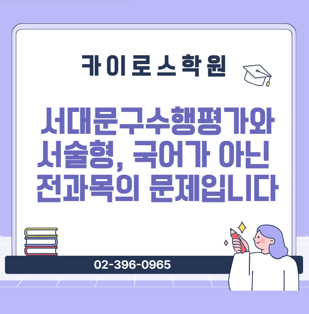 안녕하세요. 서대문구수행평가 전문 카이로스학원에서 인사드립니다. 서술형 문제와 수행평가, 아직도 국어나 사회에만 해당된다고 생각하시나요? 요즘의 중·고등학교 평가 방식은 전 과목에 걸쳐 서술형과 수행 중심 평가가 강화되고 있습니다. 단답형 문제만으로는 학생의 사고력과 표현력을 측정하기 어렵다는 교육 방향이 반영된 것이죠. 이제는 수학, 과학, 영어, 심지어 예체능 과목까지도 ‘자신의 언어로 설명하고 정리하는 능력’이 성적을 좌우하는 요소가 되었습니다. 하지만 문제는 여기에 있습니다. 아이들은 대부분 답은 알고 있어도, 쓰지를 못하거나 말로 설명하지 못합니다. 특히 문제 풀이에는 익숙하지만, 그 과정을 서술형으....... <img src="https://blogthumb.pstatic.net/MjAyNjAxMDZfNjgg/MDAxNzY3Njc3NDYwNTM4.iFlQeFu27f51F-HbiZzQULdsSjOkg-u_jxNQqNK_3d0g.ocW6csyfmSU8ZwLqWMsw_NvBduWp0NIqqcbG4YwjVu4g.PNG/image.png?type=s3" />