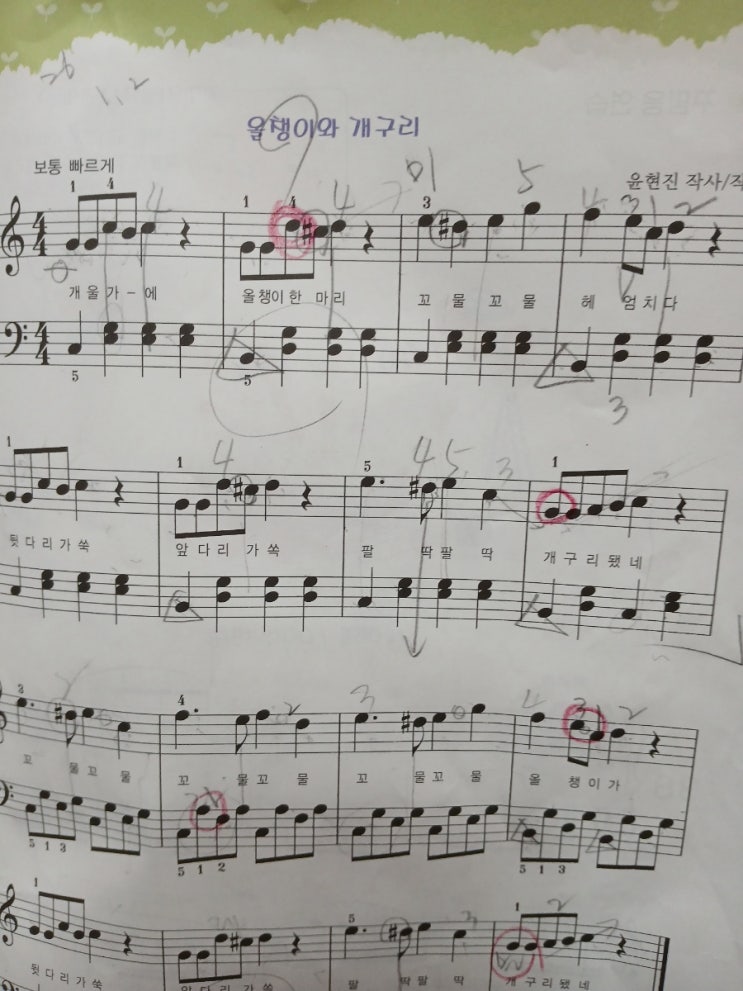 저학년 아이들에게는 어려운 곡보다, 익숙한 노래를 통해 악보를 읽고 이해하는 힘을 기르는것이 무엇보다 중요합니다 오늘은 8살 *한이와 함께 **올챙이와 개구리** 로 기초 수업을 했어요 노래로 이미 알고있는 멜로디이기 때문에 *한이는 자연스럽게 박자를 느끼고, 음의 높낮이를 귀로 먼저 이해한뒤 악보를 연결하게 됩니다 연주한 후에 음표를 하나씩 짚어보고 중요한 부분이나 틀렸던 부분은 직접 표시해보며 악보를 읽는 습관을 만들어가요 1.손가락 번호 인식 2.박자와 리듬감각 3.악보 읽기 기초 4.집중력과 학습태도 어릴때 만들어진 기초는 오래가지요 그래서 저희 한양 음악학원에서는 속도보다는 방향을, 결과보다는 과정을 중요하....... <img src="https://blogthumb.pstatic.net/MjAyNjAxMTJfMTYz/MDAxNzY4MjE4NjM2MTE2.UrDPvZbE0KMdi0VTVNu7lbQm5vh-C8xwOPFuLNdJQnAg.vC8tDm7c4GCg3jVkt5VXG4dxQ-5fuL2EZx1T3udjNSAg.JPEG/900%A3%DF20260109%A3%DF152628.jpg?type=s3" />