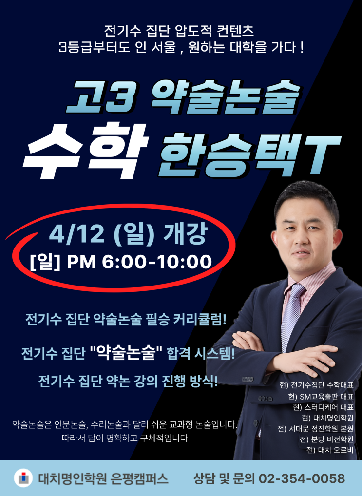 ✔ 3등급 이하 학생들이 누릴 수 있는 전형 ✔ 3등급부터도 인 서울 , 원하는 대학을 가다 ✔ 은평 약술논술 마감반 신화 4월 12일 개강 [ 일 ] PM 6:00 - 10:00 대치명인학원 은평캠퍼스와 전기수 집단의 압도적인 컨텐츠! 약술논술 강의가 개강합니다! "약술논술은 인문논술, 수리논술과 달리 쉬운 교과형 논술입니다. 따라서 답이 명확하고 구체적입니다." 수학이 어려운 학생도 도전할 수 있는 마지막 기회! 놓치지 마십시요. 대치명인학원 은평캠퍼스 상담 및 문의 : 02-354-0058 문자전용 : 010-6221-0052 #은평명인학원 #대치명인은평캠퍼스 #대치명인학원 #은평구학원 #수능전문학원 #고등전문학원 #내신전문학원 #고3전문학원....... <img src="https://blogthumb.pstatic.net/MjAyNjA0MDhfOTQg/MDAxNzc1NjQ3NDcxNjQ0.lCODx6Sa9kYo2X6bpyWR_CMGGAqh_izIRuNLNBu7kG8g.wmeAFGH_3N4mApULK78QRLGv9ESBtGY4Ma1MLyYSjo0g.PNG/%BE%E0%BC%FA%B3%ED%BC%FA_%BC%F6%C7%D0.png?type=s3" />