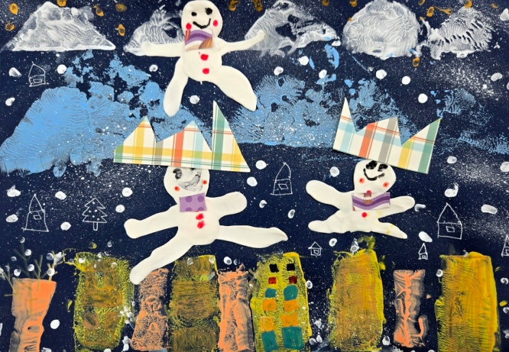 안녕하세요☃️ 은평뉴타운 상림마을 820동 유니팝 은평상림마을센터 미술학원 입니다. 12월 유치부 친구들은 창의 회화 - 설인이 놀러왔어요! 수업을 진행해 보았습니다. 겨울밤마을에 몰래 찾아온 설인을 표현해 보는 수업으로 설인은 일반적으로 무섭다고 알려져 있지만 사실은 부드러운 털과 부끄럼이 많은 귀여운 성격을 가진 상상의 존재라고 합니다. 수업 과정에서는 먼저 큰 삼각형과 작은 삼각형, 다양한 크기의 사각형을 그린 후 오려 산과 건물의 형태를 찍어내며 원근감을 배워봅니다. 흰색 포스카로 건물의 불빛과 주변을 밝히며 겨울밤의 분위기를 표현하고 눈발을 뿌려 눈의 질감과 공간감을 살려주면서 숨어있는 설인을 재미있게....... <img src="https://blogthumb.pstatic.net/MjAyNTEyMTFfMjk0/MDAxNzY1NDU3OTAwMzY5.ZjN4c3TnyY-xbdGQVonjMxR9Wg0PPmFPMg_5oHmNbWMg.te5xmUQbTwjDNk7d7_4M8jlVI_UYpGEpcvmxbmUEfG4g.JPEG/900%A3%DF20251211%A3%DF175238.jpg?type=s3" />