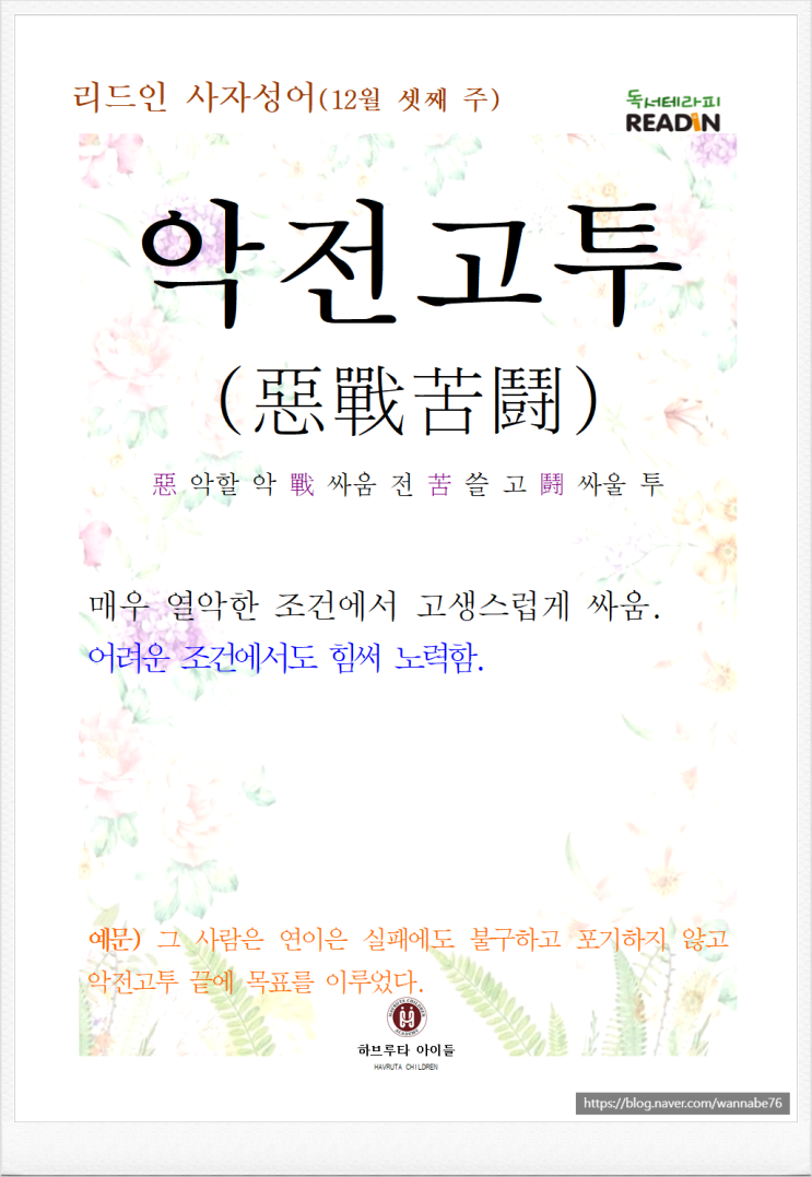 이번 주 사자성어는 ‘악전고투’입니다. 매우 열악한 조건에서 고생스럽게 싸운다는 의미로, 어려운 조건에서도 힘써 노력함을 뜻합니다. 즉, 상황이 너무 힘들고 불리해도 물러서지 않고 계속 노력하는 모습을 말합니다. 시험 준비, 운동 경기, 힘든 생활 속에서 끝까지 버티며 노력하는 모습에 잘 어울리는 표현으로 쓰입니다. 악전고투와 같이 힘들어도 포기하지 않고 끝까지 최선을 다하는 친구들 되길 바랍니다. 오늘도 활기찬 하루 되세요! <img src="https://blogthumb.pstatic.net/MjAyNTEyMTVfMTk1/MDAxNzY1Nzc1ODY5MTYy.cqNnuowedBCLeXLbob7EhCJLwTs0KOvzK8FbA-prAJkg.WI_-1ENrat60FOl4eB8CPcZI88tx21iTyvj-05c9QSUg.PNG/25%B3%E2_12%BF%F9_15%C0%CF_%BE%C7%C0%FC%B0%ED%C5%F5001.png?type=s3" />