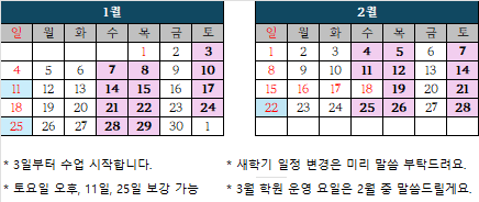 재원생들은 연말까지 개별 연락 드리겠습니다. 1월 수업은 - 수/목 저녁 7시 이후 - 토요일 오전 9시 부터 가능합니다. 감사합니다. <img src="https://blogthumb.pstatic.net/MjAyNTEyMjBfMTk0/MDAxNzY2MjAyMTg1MzI3.KE5gOoWU0bPQQclKGSZIYZjCIb9v2J9ZQx-A4zr6Vvwg.YEpisj539HoSsNH6yHXXuiXgOduZm9Pz8SZ1xLOSzUEg.PNG/1766189607891.png?type=s3" />