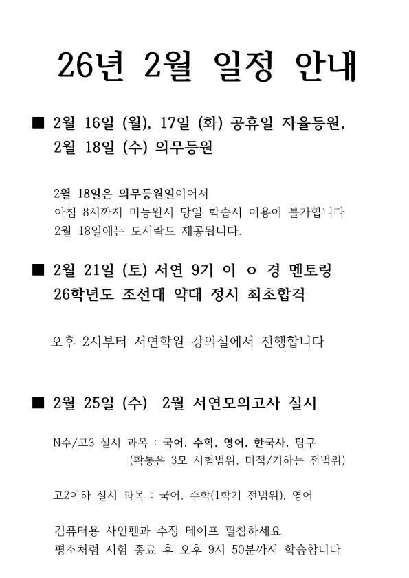 안녕하세요 #전주재수학원 #전주독학재수학원 #전주서연학원 입니다 N수/예비고3 학생들은 3모에서 우수한 성적을 맞기 위해서, 예비고2 이하 학생들은 1차고사 내신에서 좋은 성적을 내기 위해서 독학재수전문 전주서연학원은 아래와 같은 2월 일정을 마련했습니다. 이번에 26학년도 전남대 의대 합격자 서연 9기 최민준 학생 멘토링을 1월에 진행한데 이어 26학년도 조선대 약대 정시 최초합격자 서연 9기 이 ㅇ 경 학생 멘토링을 2월에 전주서연학원 강의실에서 진행합니다. 또한 2월 25일에는 2월 서연모의고사를 통해 3모 및 1차고사 내신을 확실히 다지는 시간을 갖습니다. 항상 초반을 중요하게 여기는 전주서연학원. 올 한해도 초반 기선....... <img src="https://blogthumb.pstatic.net/MjAyNjAyMDNfNDkg/MDAxNzcwMDg3NjczMTcw.RzcgxofHaLcaEZbQAlNAIvho7NsY0pTgp8Q1b6FhSIMg.AObJU1SQgmGYvXoPqzu2Zg6z_Luk0SoR0SAcfM6fbmQg.PNG/26%B3%E2_2%BF%F9_%C0%CF%C1%A4_%BE%C8%B3%BB_1.png?type=s3" />