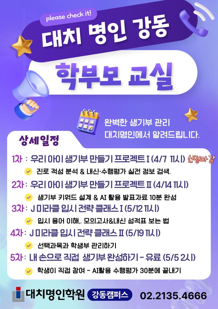 안녕하세요, 대치명인학원 강동캠퍼스입니다. 새 학기가 시작되고 우리 아이들의 학교생활기록부(생기부) 관리에 고민이 많으실 시기입니다. "진로 적성은 어떻게 녹여내야 할지?", "수행평가와 내신은 어떻게 조화시킬지?" 막막해하시는 학부모님들을 위해 대치명인 강동에서 특별한 [학부모 교실]을 준비했습니다. 이미 1차 세션은 학부모님들의 뜨거운 성원으로 '신청 마감'되었습니다! 남은 차수 또한 조기 마감이 예상되니, 아래 상세 일정을 확인하시고 서둘러 예약해 주시기 바랍니다. 학부모 교실 상세 일정 안내 1차: 성황리에 마감 2차 : 우리 아이 생기부 만들기 프로젝트 Ⅱ 일시: 4월 14일(화) ....... <img src="https://blogthumb.pstatic.net/MjAyNjA0MDFfMTAz/MDAxNzc1MDMxMjc2MTA3.nIJ6Tm6dG11PoZXpZHNoxZVJWgVqDuuomXASxsPXGUUg.a1T098xgX-nS4CcmOSn4pc1MpGEqrySgHXOOceuDMEMg.JPEG/%C7%D0%BA%CE%B8%F0_%B1%B3%BD%C7_%283%29.jpg?type=s3" />