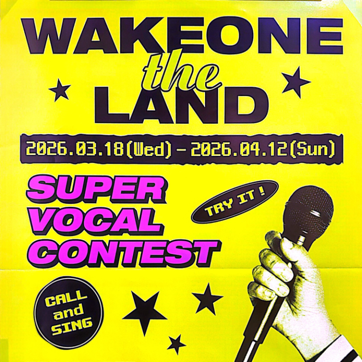 안녕하세요! 광진구 군자역 오디션 학원 전공 실용음악 레슨 · 오디션 레슨을 진행하고 있는 "누구나 음악을 할 수 있는 작은 행성" '보컬플래닛 실용음악학원'입니다. Vocal Planet 이번에 전해드릴 오디션은 '2026 WAKEONE the LAND' Super Vocal Contest 입니다! 바로 내용 알려드릴게요! 지원기간 2026년 3월 18일(수) ~ 4월 12일(일) 지원대상 2007년생 ~ 2015년생 출생자(성별, 국적 제한 없음) 지원방식 070-4522-0412 전화 후 보컬 곡 녹음으로 진행 상담 및 문의 보컬플래닛 실용음악학원을 다니고 있지 않으셔도 괜찮아요! 아래 톡톡상담이나 0507-1349-4583으로 전화주세요! CJ ENM 산....... <img src="https://blogthumb.pstatic.net/MjAyNjA0MDFfMTY0/MDAxNzc1MDQwMTU1MTkw.i2dNdkMPZhdJxp-MpbZbdYs2spQVK_Di-e6-ph6dvyIg.cT-roSBtlKezpl4auQ-9wCShS0_cZFkOk7HKxsff5Tgg.PNG/a12312312.png?type=s3" />