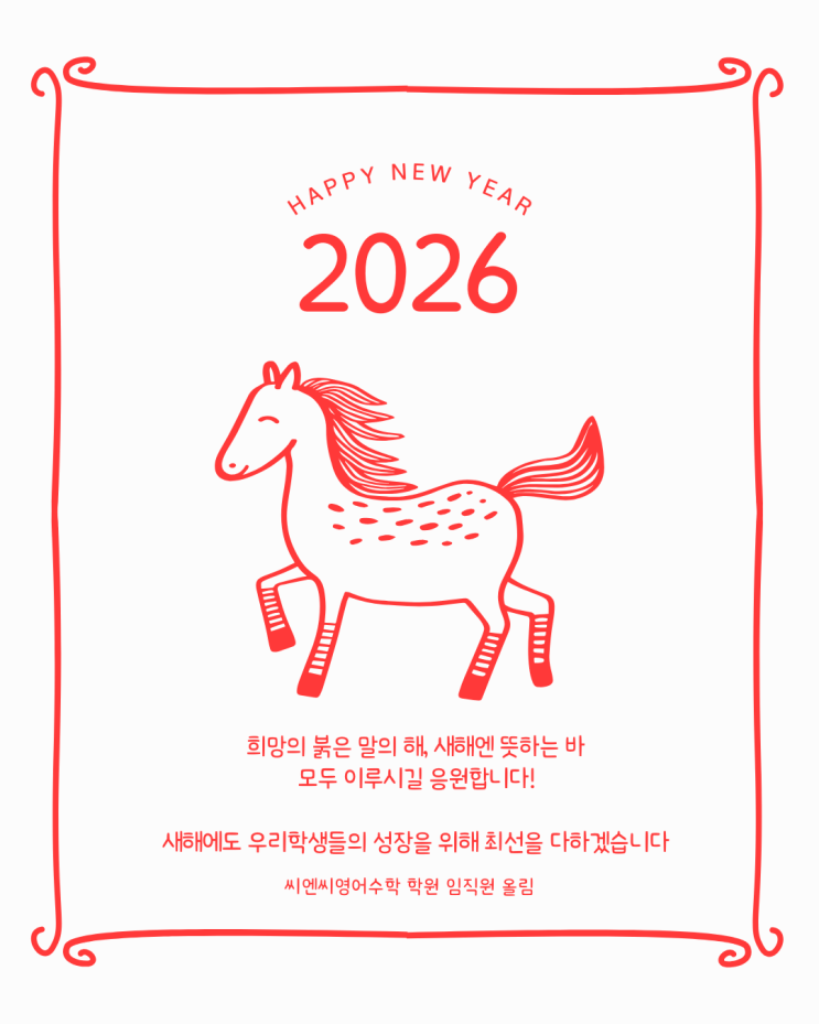 희망의 붉은말의 해, 새해엔 뜻 하는 바 모두 이루시길 응원합니다~ 새해에도 우리 학생들의 성장을 위해 최선을 다하겠습니다~ 씨엔씨영어수학 학원 임직원 올림. https://blog.naver.com/mikesuh7/223277905239 https://blog.naver.com/mikesuh7/223272984001 https://blog.naver.com/mikesuh7/223517290925 <img src="https://blogthumb.pstatic.net/MjAyNjAxMDFfMTQx/MDAxNzY3MjQyMTEzNDMx.H32NFkLduM_oZg2OG-hGuolAxUsJ1c9_0OLF1rofAwcg.zmh9xY4DEkR9PCq-JBaLRNgZx7SA1qpc-woP3jNkvKgg.PNG/%BB%A1%B0%A3%BB%F6_%B4%DC%BC%F8%C7%D1_%B8%BB_%BB%F5%C7%D8_%C0%CE%BB%E7_%C0%CE%BD%BA%C5%B8%B1%D7%B7%A5_%B0%D4%BD%C3%B9%B0%2845%29.png?type=s3" />