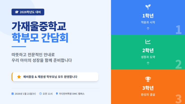 가재울중 학부모님, 새 학년 준비는 어떠세요? 3월이 얼마 남지 않았습니다. 새 학년이 시작되면 생각보다 빠르게 지나가시죠. 지금 이 시기에 한 번 정리해 두시면 한결 수월하실 거예요. 입학 예정 자녀를 두신 분 가재울중이 어떤 학교인지 궁금하실 텐데요. 내신 시스템부터 학교 특색 프로그램까지, 입학 전에 알아두시면 좋은 내용들을 안내해 드리겠습니다. 곧 중2가 되는 자녀를 두신 분 1학년 한 해 보내시면서 어느 정도 감이 잡히셨을 거예요. 2학년에는 어디에 집중하면 좋을지, 방향을 함께 잡아보겠습니다. 곧 중3이 되는 자녀를 두신 분 본격적인 고입 준비 학년이시죠. 자기주도학습전형, 내신 관리, 면접 준비 등 무엇을 먼저 해....... <img src="https://blogthumb.pstatic.net/MjAyNjAxMTVfMjI3/MDAxNzY4NDQ2NDgxNzk1.mFzubqAFO3OHm3eB3ymBKv8YO5esTR0SiCKATvCbvDcg.qvOyqq2prPDshtNMAe_2qdQkjhw9ungHr0NnYAppcfIg.PNG/%C7%A5%C1%F6.png?type=s3" />