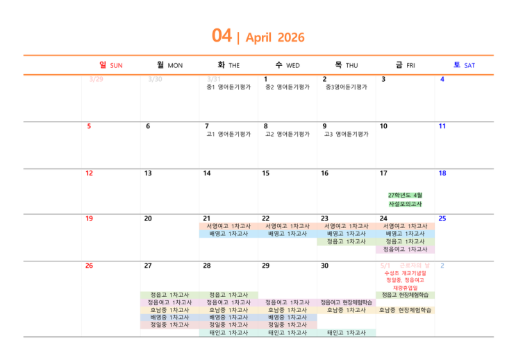 휴원일: 4/29 (수) (휴원일이지만 중등 직전보강의 경우는 정상수업 진행 예정) 4/30 (목) 정상수업 진행되며 5월 수업 시수에 포함 중등 내신대비 토요일 오전 10시부터 보충 진행중 토요일 오전 보충 및 클리닉 예약제로 운영중, 매주 월요일 사전신청 (4월 11일은 학원 사정으로 미실시) 정기 월말 평가 실시 NELT 시험 응시 주기 변경: 등록 이후 6개월부터 신청자에 한해 매월 셋째 주에 진행 (6개월 마다 응시 권장) NELT 시험 응시 신청 방법: '라엘영어 카카오톡' 으로 시험 신청 (시험비용: 학원 전액 부담) 안녕하세요. 라엘영어교습소 입니다. 라엘영어의 운영방침과 4월 등록 관련하여....... <img src="https://blogthumb.pstatic.net/MjAyNjAzMjhfMjEz/MDAxNzc0NzA2NzAzOTM3.TG6Z8lDJNaw4ccXS27fspJ_NLoWPd3vFDiyap0UwcaEg.vo_A-ulD2uBqhbEi6jUS_ZaGRpp81bHhtdtBr2ic4sQg.PNG/002.png?type=s3" />