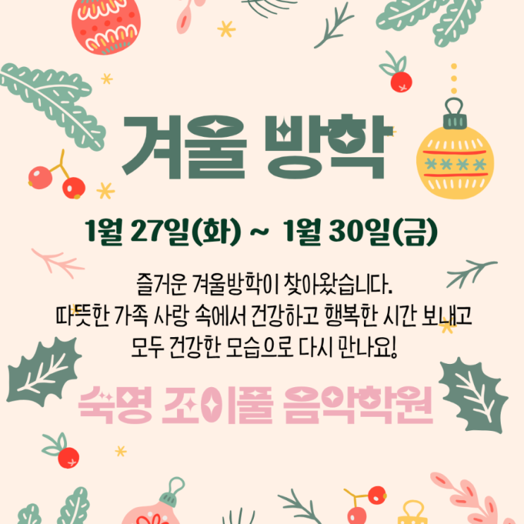 ❤️ 숙명 조이풀 음악학원 겨울방학 1월 27일(화) ~ 1월 30일(금) 차가운 바람 속에서도 마음을 따뜻하게 해주는 겨울방학이 찾아왔습니다. 사랑하는 가족과 함께 웃음과 휴식이 가득한 시간 보내고, 몸도 마음도 한 뼘 더 자라 밝고 건강한 모습으로 다시 만나요. 숙명 조이풀 음악학원 ♡ https://www.instagram.com/p/DT4H2BpEqHm/?igsh=c3F6eGxzZmo4Zjcz #정읍음악학원#정읍피아노학원#정읍맘그램#정읍콩쿨전문학원#정읍피아노학원차량운행#정읍상동#정읍동신초#정읍한솔초#정읍남초#정읍동초#정읍피아노전문학원#정읍상동피아노#정읍유치부피아노#숙명조이풀음악학원#숙명조이풀 <img src="https://blogthumb.pstatic.net/MjAyNjAxMjRfMjM2/MDAxNzY5MjI0MjQ1NDM2.z-M5nbOuQuGfz3kTHckREWxXPgVM-wUjtCrkxeB05ZQg.YbbWztATACRvRBifHGIyqV0yJwQbaTQWOSDMbzlEKWkg.PNG/900%A3%DF1768549950194.png?type=s3" />