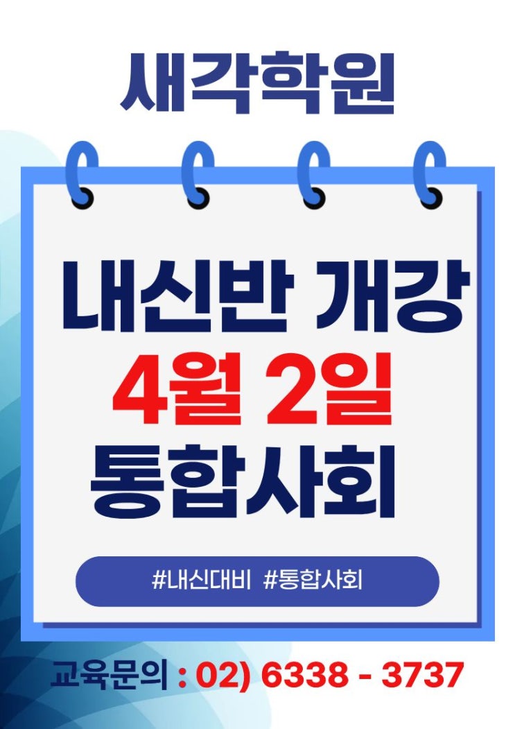 안녕하세요. 새각학원 새각지기입니다. 1학기 중간고사 통합사회 내신반 개강 안내입니다. 통합사회 내신반 4/2(목)~4/5(일)개강 다가오는 내신을 대비하여 통합사회 내신 대비 수업을 개강합니다. 내신 시험은 단순한 암기가 아니라 개념에 대한 정확한 이해와 적용 능력이 중요한 평가입니다. 특히 최근 교육 흐름은 지식의 양보다 핵심 개념을 구조적으로 이해하고 활용하는 능력을 더욱 강조하고 있습니다. 2022 개정 교육과정의 변화 통합사회 1등급 이러한 변화 속에서 통합사회는 경제, 사회, 윤리, 지리, 역사까지 아우르는 통합적 사고를 요구하는 과목으로 자리잡고 있으며, 고등 과정으로 이어질수록 그 중요성과 난이도는 더욱 확대....... <img src="https://blogthumb.pstatic.net/MjAyNjA0MDJfMTEz/MDAxNzc1MDgzOTc4Mzg1.qwuTdtqKdaqK-44NKroj3IosnkIPpzK-Hf297nnjGUUg.PVAF5eRAYuecNL3TDcRQ1iwqBLtUmaIYFrz5Z6jwjlsg.JPEG/%C1%A6%B8%F1%C0%BB_%C0%D4%B7%C2%C7%D8%C1%D6%BC%BC%BF%E4.-_%BA%B9%BB%E7%BA%BB_%285%29_%283%29.jpg?type=s3" />