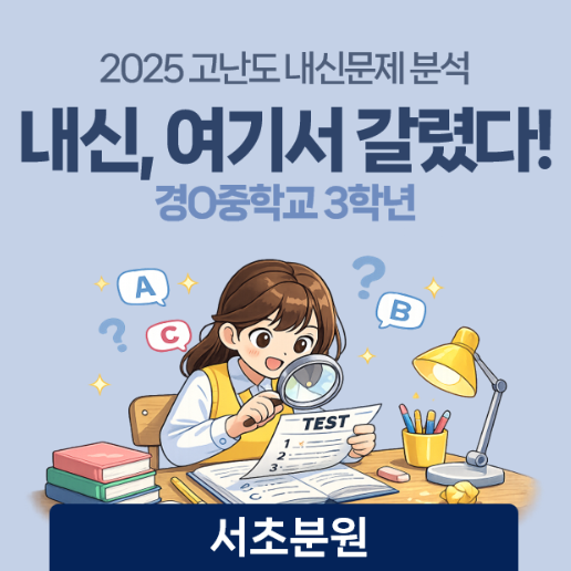안녕하세요 정상어학원 서초분원입니다. 벌써 4월입니다. 학기 시작인 3월 한 달도 금방 지나갔네요. 4월은 꽃이 만발해지는 달인 동시에 중학생들에겐 첫 중간고사가 다가옴을 느끼게 되는 달이지요. 그래서 이번엔 중3학년 학생들을 위한 문제를 가져왔습니다! 2026년 새학년, 새학기 맞이 학습전략 시리즈인 "2025 내신, 여기서 갈렸다!" 오늘은 그 9번째 이야기! 경O중학교 3학년의 문제를 가져왔습니다. 작년 중학교 내신문제 중 학생들이 많이 틀렸던, 또는 고난도라 할 수 있는 문제들을 선별하여 분석하여 , 학생들로 하여금 2026년 내신준비에 큰 그림을 그릴 수 있도록 합니다. (블로그에 업로드 되는 문항은 해당 학교의 출....... <img src="https://blogthumb.pstatic.net/MjAyNjA0MDNfMTY5/MDAxNzc1MTg4NTgzODI2._Y40_uSMka3vQSm-opl-ptsmFg6asE9JasLlOQuQ50Qg.HP3JxRqkH6k86b1rj4oMbrqnO7jzrntrQI2QOBalqhcg.PNG/%BD%BA%C5%A9%B8%B0%BC%A6_2026-04-03_125609.png?type=s3" />