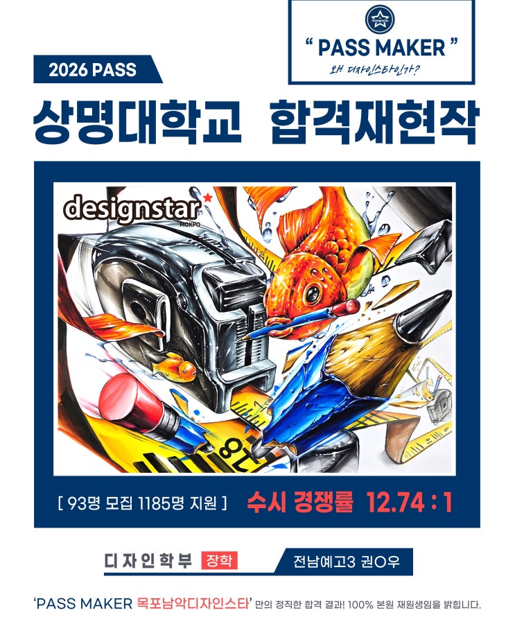 안녕하세요. 목포 남악 디자인 미대입시 전문 '디자인스타미술학원' 입니다! 오늘 포스팅할 내용은 상명대학교에 합격한 학생들의 합격작과 평소작 입니다. 목포 남악 디자인스타에서는 올해 당당히 "2명"이 모두 장학생으로 합격하게 되었습니다! 올해 상명대학교 수시 전형은 실기전형에서 1185명이 몰리며 그 인기를 체감했습니다. 대한민국에서 디자인학부 최초로 설립하여 운영한 전통 강호인 대학으로서 천안에 위치한 수도권 입지 덕분에 디자인학부 지원인원이 항상 많이 붐비는 대학이기도 하죠. 특히나 실기전형을 실시하고 있는 대학 중에서는 내신성적 관리가 매우 부담스러운 대학 중 하나입니다. 학생부에 표....... <img src="https://blogthumb.pstatic.net/MjAyNjAzMjhfMTgx/MDAxNzc0NjU5ODQ2NDQ4.YMC2ZUbIOYaBcxFw3lGAIKkeS3i2GESfbmr95eEgiC4g.B9qKFpisYPBTUee405Bw_k6lx5F_04VgnxwOc5EoEHAg.JPEG/5.%B1%C7%BD%C3%BF%EC_%BB%F3%B8%ED%B4%EB.jpg?type=s3" />
