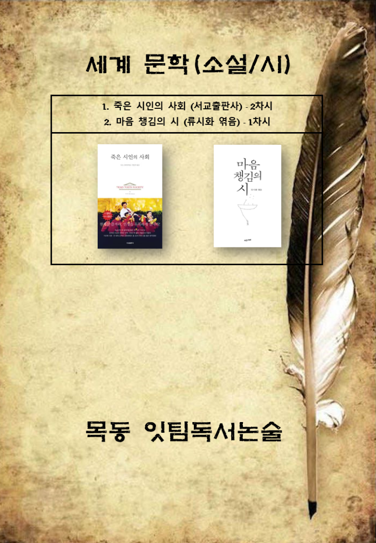 본 교재에서 학습할 도서는 1. 죽은 시인의 사회 2. 마음 챙김의 시 입니다 소설 [죽은 시인의 사회]은 보수적인 명문 기숙학교에 부임한 교사 '존 키팅'과 그를 통해 기존의 규범과 억압된 삶에 질문을 던지게 되는 학생들의 이야기를 그렸습니다 자아 발견, 자유, 교육의 의미를 사색하게 하며, 이상과 현실의 충돌이 남기는 비극적 여운을 담고 있습니다 본 책 수업에서는, 각기 개성이 다른 학생들이 키팅 선생을 만나 어떻게 변화했는지 살펴본 뒤 키팅 선생의 교육 방식에 대해 어떻게 생각하는지 특히, 타 교사가 그에게 "학생들을 예술가가 되도록 부추기는 것은 위험한 일이요. 그들은 자신들이 모차르트, 셰익스피어 같....... <img src="https://blogthumb.pstatic.net/MjAyNjAxMTRfMTU2/MDAxNzY4MzIwNzg5ODMw.NhRIHQn20UvvA8PNFDR8HmDY84UiIWLAVxk3u3YR08Yg.9qyaUAMXzUR7UiLxyv8_JIS7i-wSQR1XhW-ldvg_Mgcg.PNG/2.png?type=s3" />