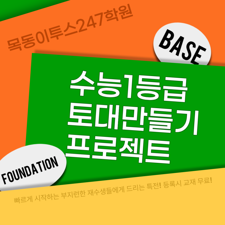 #목동독학재수 #수능정시 #정시발표 #이투스247 #독재학원 #재종 #목동재수 #재수단과 #추가합격 #독재질문 #정시추합 #수능일정 #정시수시 목동이투스247학원, 1·2월 ‘1등급 토대만들기 프로젝트’ 수능 준비에서 가장 중요한 것은 기본기입니다. 목동이투스247학원에서는 2026년 1월과 2월 동안 수능을 준비하는 **전 학년 학생들을 위한 ‘1등급 토대만들기 프로젝트’**를 진행합니다. 이번 프로젝트는 단순한 문제 풀이가 아닌, 성적 상승의 출발점이 되는 핵심 기초 학습에 집중합니다. ✔ 과목별 학습 구성 국어: 수능 독해의 시작, 필수 어휘 학습 강화 수학: 성적 하락의 원인을 점검하는 중학 수학 과정·고등 공통과정의 구멍 찾기 영....... <img src="https://blogthumb.pstatic.net/MjAyNjAxMTRfOTIg/MDAxNzY4MzcyMDk2Njkw.SAsnXZ2gW3jIEzOdSr8YPvpYbL8PcbSx8kYZuYjt8aYg.SlaJCaeZVSawt7k4yz6jxueIdENV3C3lhjc3eNX0RSUg.PNG/1.png?type=s3" />