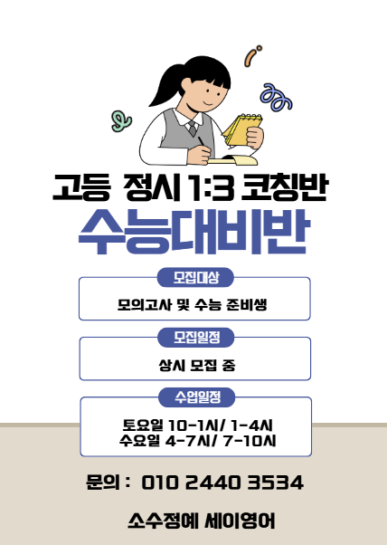 4월 고등 정시 영어 코칭반 모집] 수능 영어는 문제를 많이 푸는 것보다 틀리는 이유를 정확히 고치는 것이 중요합니다. ✔ 원장 직강 ✔ 1:3 소수 코칭 ✔ 개별 진도 / 약점 집중 보완 ✔ 정규 수능반 이동 가능 현재 운영 시간 수요일 4-7 / 7-10 토요일 10-1 / 1-4 정시 준비가 필요한 학생은 상담 후 참여 가능합니다. <img src="https://blogthumb.pstatic.net/MjAyNjAzMTNfMTU1/MDAxNzczMzI4NjgzMzUw.zPU25i4lgZlQyZ7l_taFAk0HO0wooMdm3Ntp10R1Cmgg.Hmq3LZoUuoVOeAfjyx6QcMTxTLSTVnWzusfuZoGAktEg.PNG/1773298127896.png?type=s3" />