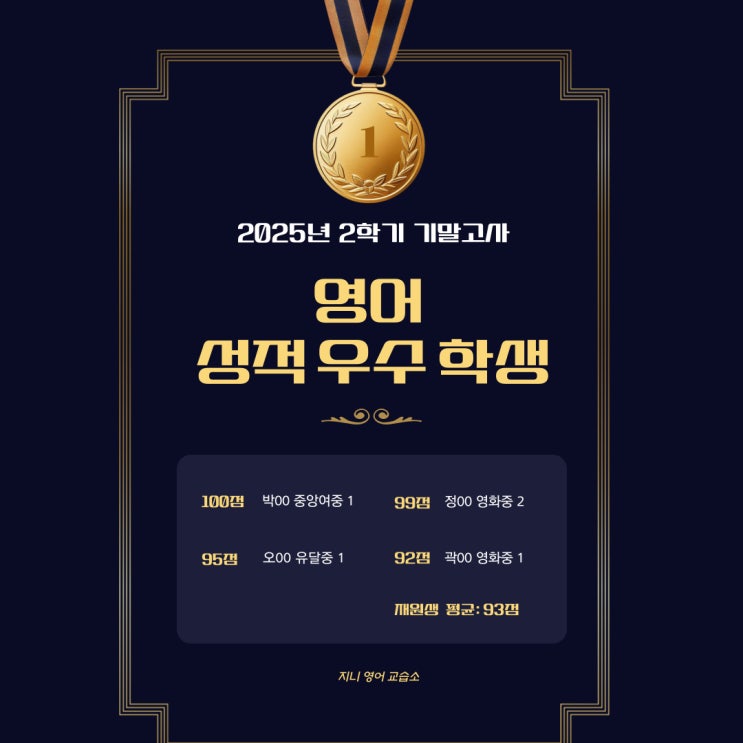 [목포 석현동 영어/지니샘] 2025년 2학기 기말고사 성적 우수 학생
