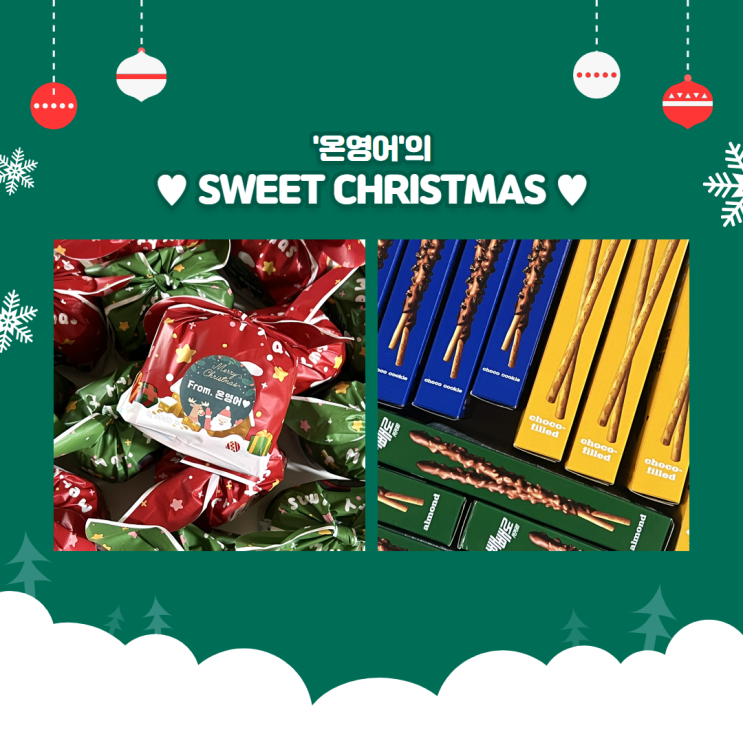 안녕하세요~ 온영어입니다. 2025년 크리스마스를 맞아 1년 동안 고생한 온영어 아이들을 위한 이벤트를 준비했습니다^^ 초등학생들을 위한 간식 꾸러미, 중고등학생들을 위한 달콤한 빼빼로입니다. 크리스마스 이브날도 여느때와 마찬가지로 우리 온영어 아이들은 성실히 수업을 들었고, 끝나기 5분 전에 선물을 내미니 놀라고 기뻐하던 표정에 저도 덩달아 기뻤습니다 크리스마스라고 손수 에그타르트를 만들어서 선물로 준 우리 학생 덕분에 오늘 하루 마음도 따뜻해졌네요^^ 학부모님들의 응원도 항상 감사합니다. 영어에 꾸준한 흥미를 가지고 한걸음 한걸음 쑥쑥 커나가는 온영어 학생들의 성장한 모습을 내년에도 기대해봅니다. 앞으로....... <img src="https://blogthumb.pstatic.net/MjAyNTEyMjVfMTMg/MDAxNzY2NTg5NDM0MzYx.bwCQ6pfeqkdmnEMWxU6BOST-85YTYK-KEA-xAYo-4uwg.VjsF47dIrp5H2O84RM-Rh7ECCN6TmivLVPK9Nr-8oLYg.PNG/%C5%A9%B8%AE%BD%BA%B8%B6%BD%BA.png?type=s3" />