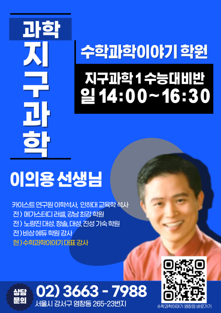 수능 지구과학, 제대로 준비하고 싶다면? 수학과학이야기 학원 지구과학 1 수능대비반 개설 안내! 수능 과학탐구 영역 중에서도 매년 고득점을 가르는 핵심 과목, 지구과학 1. 혼자 공부하기 어렵고 개념의 폭이 넓어 전략적인 학습이 필수인 과목입니다. 그래서! 수학과학이야기 학원에서 체계적으로 준비할 수 있는 지구과학 1 수능대비반이 새롭게 개설되었습니다. 이의용 선생님은 어떤 분인가요? 이의용 선생님은 다양한 교육 경험을 보유한 지구과학 전문 강사로, 다음과 같은 경력을 갖추고 있습니다. 학력 & 교육 전문성 KAIST 교육학 석사 인하대학교 교육학 석사 주요 경력 메가스터디 러셀 강남 주요 학원 출....... <img src="https://blogthumb.pstatic.net/MjAyNTEyMTJfMTA1/MDAxNzY1NTI4MDE2NzM5.0Kxlm3qGEm7FxN6D3tgzRnPK10OJ6wH3DLKkirKHqbEg.aA54Mto0NzuN0rSRSm22NdnzcJkiJRNOSNA2ICYhtHIg.PNG/%BE%C6%C6%C4%C6%AE-%C0%FC%B4%DC%BD%C3%BE%C8-01-006_%281%29.png?type=s3" />