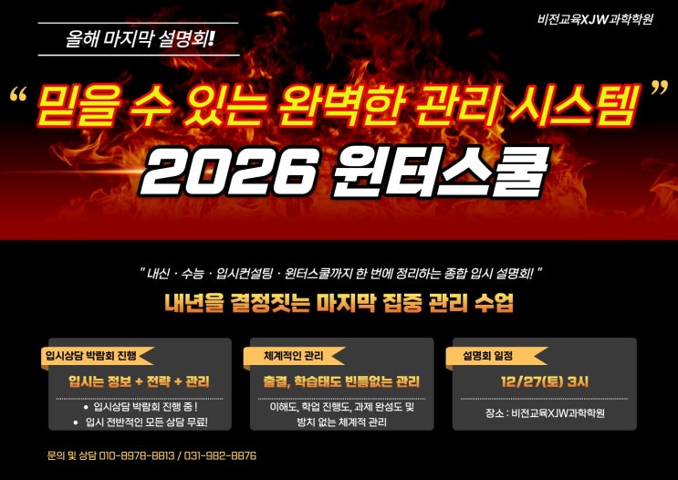 올해 마지막 설명회! 방학 때 실력을 완성할 기회 "다가오는 겨울방학을 어떻게 보내느냐에 따라 2025년 성적과 입시 결과가 완전히 달라집니다." 그래서 준비했습니다! 내신 · 수능 · 입시컨설팅 · 윈터스쿨까지 한 번에 정리하는 종합 입시 설명회!! 비전교육XJW과학학원 윈터스쿨만의 차별화된 관리 방법 ✔️ 방치하지 않는 학원 ✔️ 매일 학습 체크 & 지속적인 관리 ✔️ 과제 미달 시 추가 보충 클리닉 진행 ✔️ 출결, 학습 태도, 이해도까지 빈틈없는 관리 “알아서 하겠지”가 아닌, 끝까지 끌고 가는 빡센 관리 이런 학생에게 추천합니다. 방학마다 계획만 세우고 실천이 어려운 학....... <img src="https://blogthumb.pstatic.net/MjAyNTEyMThfMTIg/MDAxNzY2MDM1NzU2NjY0.9GW2LlzfuN8fVPC-5S3FdqDAdZ7gFdks1-4r50w3sIQg.zdzb2Pfq50PPAAxjJ7u5HzbDcqY2QGvslhzp5Ma5mjkg.JPEG/%B0%FC%B8%AE%C7%FC_%C0%A9%C5%CD%BD%BA%C4%F0.jpg?type=s3" />