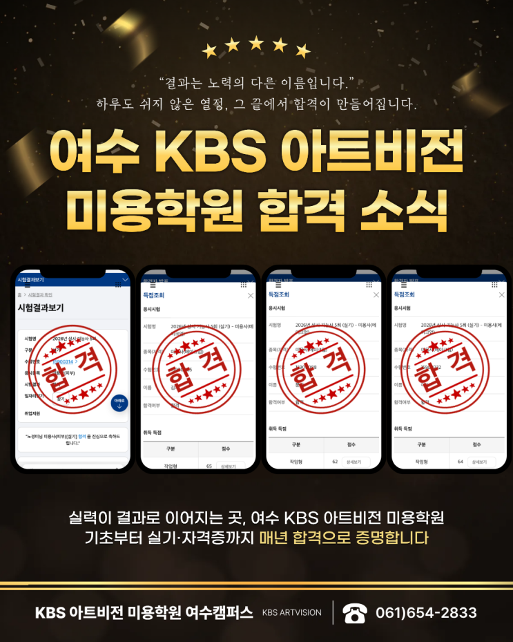 여수미용학원 여수국비미용학원 KBS아트비전미용학원 제5회 상시 기능사 실기시험 전원 합격 후기 안녕하세요~ 미래를 디자인하는 여수 KBS아트비전미용학원입니다. 오늘은 정말 기쁜 소식을 전해드릴 수 있게 되었어요 여수 KBS 아트비전 미용학원에서 제5회 상시 기능사 실기시험 합격자가 다수 배출되었습니다! 시험 결과를 확인하는 순간, 학생들 한 명 한 명의 얼굴이 떠오르더라고요. 처음 학원에 왔을 때는 가위 잡는 것도, 손 쓰는 것도 어색해하던 모습이었는데… 이렇게 당당하게 “합격”이라는 결과를 만들어낸 걸 보니 정말 뿌듯했습니다. “결과는 노력의 또 다른 이름입니다.” 이 말이 이번 시험을 보면서 더 와닿았어요. 학....... <img src="https://blogthumb.pstatic.net/MjAyNjA0MDJfNDkg/MDAxNzc1MDk5NzMxODUz.h14a2hBASeMqTgAF6kPGRUq7V8IAzl2x3n-SUdfPgiQg.mWem7N0EOr0gADo6tRhJomhDmXaRXZVe46O79OrpDdQg.PNG/%C1%A6%B8%F1%C0%BB_%C0%D4%B7%C2%C7%D8%C1%D6%BC%BC%BF%E4_%282%29.png?type=s3" />