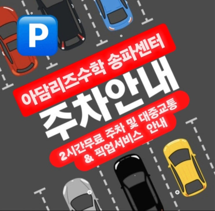아담리즈수학 송파센터 주차 및 교통 & 픽업서비스 안내 무료 주차 2시간 롯데마트 송파점 주차장 방향으로 오셔서, 오른편 파리바게트 건물 뒷편으로 들어오시면 주차장 입구입니다! 승강기를 타고 지하 2층, 3층으로 내려오시면 자주식 주차입니다. 픽업 서비스 안내 건물 1층 픽업서비스 진행하고 있습니다. 대중 교통 가락시장역 8번출구 바로 앞 1층 스타벅스 건물, 6층입니다. 도보 5분 이내 마트 이용 센터방문시 장보는 분들 계셔서 도보 5분내 인근 마트 주차안내 드립니다. 1. 센터 맞은편 가락몰 5관 남1문주차장 (지하3층 승용차주차장)이용 3시간미만 주차료 1000원. 2.센터 맞은편 롯데마트 송파점 5....... <img src="https://blogthumb.pstatic.net/MjAyNjAyMDlfMjAx/MDAxNzcwNjA2MjMxNzA1.Y1WVL6bpxV09AdF9RuKfZk_A9BWAmqWf-ig7IsHlMGAg.vavnmgH0_n16RmorUy84VqcNyLJ_hzmDo0CidAAT_o4g.JPEG/900%A3%DFScreenshot%A3%DF20260209%A3%DF114245%A3%DFInstagram.jpg?type=s3" />