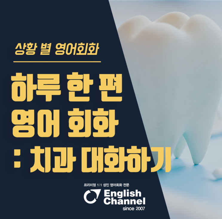 안녕하세요! 잉글리쉬채널 구로센터입니다. 해외에서 생활하거나 외국인과 대화하다 보면 치과에 가야 하는 상황이 생각보다 자주 생기는데요. 오늘은 방문 시 실제로 바로 쓸 수 있는 치과 영어표현 문장을 상황별로 정리해 보겠습니다. 1. 방문 전 상태를 설명할 때 쓰는 치과 영어표현 치과에 가기 전, 자신의 상태를 먼저 설명해야 할 때 이렇게 말할 수 있습니다. I have a toothache that won’t go away. → 계속 치통이 있어요. My tooth hurts when I bite down. → 이를 꽉 물면 아파요. My gums feel swollen and sore. → 잇몸이 붓고 아픈 느낌이에요. I think I might have a cavity. → 충치가 있는 것 같아요. 2. 예약·접수 상황....... <img src="https://blogthumb.pstatic.net/MjAyNTEyMTZfMzkg/MDAxNzY1ODQ4MzI3MDM5.EE-WZGn4mCUyjnH7KV1gta-nagpg6_AquvJq8FD7uTog.16ayolTK0KrNpbPTu2Luu1PE0VqJcRcQ7dR8rqJ-nykg.PNG/%C1%A4%BA%B8%BC%BA.png?type=s3" />