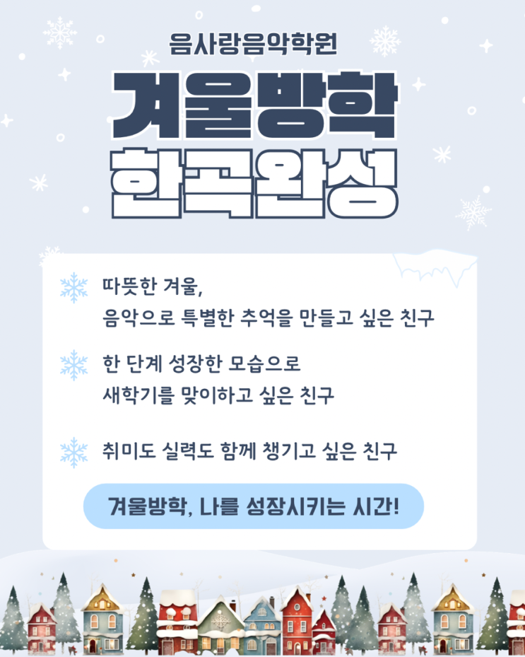 ⠀ 다가오는 겨울방학, 음악으로 실력과 추억을 함께 쌓는 시간 한곡 완성 도전할 친구들 음사랑으로 오세요~^^ 음사랑음악학원 ✅ 교육과목 : 피아노, 드럼 ✅ 교육대상 : 유아반, 유.초.중.고등부 ⠀ 교육상담문의 ✅️ 본원 : 061.791.1611 광양시 사동로 186 3층 / 광양 마동초등학교 부근 ⠀ ✅️ 2호점 : 061.791.3008 광양시 오류로 53 2층 / 광양 중앙초등학교 부근 ⠀ ⠀ #음사랑음악학원 #중마동피아노학원 #겨울방학 #한곡완성 #겨울방학도전 #중마동피아노학원 #음사랑피아노 #마동피아노학원추천 #피아노학원추천 #마동피아노학원 #음사랑음악학원 #드럼연주 #드럼 #광양드럼 #중마동드럼 #피아노학원 #중마동음악학....... <img src="https://blogthumb.pstatic.net/MjAyNTEyMjZfMjE3/MDAxNzY2NzE4OTQ0NDA4.kH0qQlSTMxVEr1OiXz9V0gU-slVSoisANXUEjrlhquAg.re5Nq6f1ItH8OpiNpM50ZuJipLt94VqeN3OhYIjwirEg.PNG/%C6%C4%B6%F5%BB%F6_%B0%DC%BF%EF_%C0%CF%B7%AF%BD%BA%C6%AE_%B0%DC%BF%EF%B9%E6%C7%D0_%C6%AF%B0%AD_%C0%CE%BD%BA%C5%B8%B1%D7%B7%A5_%B0%D4%BD%C3%B9%B0%A3%A845%A3%A9.png?type=s3" />