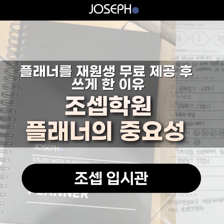 안녕하세요 조셉학원에서 아이들에게 ‘진짜 공부’를 하게 만들기 위해 준비한 학습 플래너 이야기를 전해드리려고 합니다. 요즘 학생들, 공부 시간을 채우긴 하지만 ✔ 무엇을 했는지 기억이 안 나고 ✔ 계획은 세우는데 실천이 안 되고 ✔ 열심히 했다고 느끼는데 성적은 그대로인 경우가 많습니다. 그래서 조셉학원은 “공부한 척”이 아니라 “공부한 흔적”이 남는 플래너가 필요하다고 생각했습니다. 아이들에게 진짜 공부를 시키기 위해 만든 플래너 이번 플래너는 조셉학원 입시 김지원 선생님이 직접 설계·제작했습니다. 서울대 교육학과 전공, 그리고 입시 현장에서 수많은 학생들을 지도하며 느낀 한 가지는 분명했습니다. http....... <img src="https://blogthumb.pstatic.net/MjAyNjAyMDVfMjY4/MDAxNzcwMjc0OTA4MTkw.RvbFcor5If8YvKQUfFXDm0G1Z0qKjH3C9K7aLTkM7vUg.2dUREcyUc8eLnJ2luu7bYVPPckaRver1nk9M_TxdsE4g.JPEG/2026%BC%F6%B4%C9%BA%D0%BC%AE-%C0%D4%BD%C3%BA%ED%B7%CE%B1%D7-001_%281%29.jpg?type=s3" />
