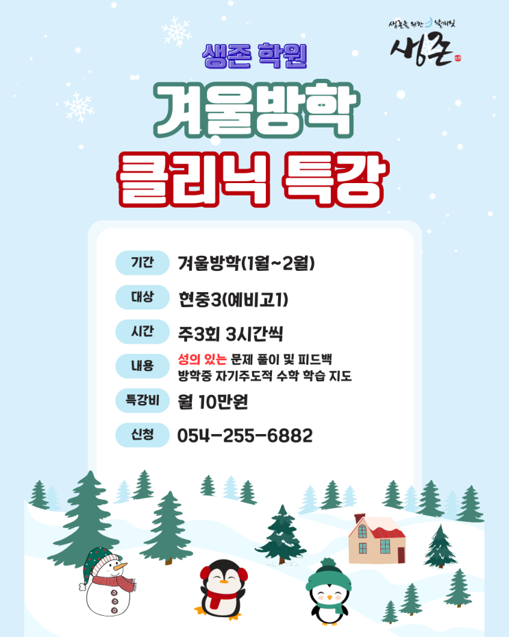안녕하세요~ 생존학원입니다 :) 오늘은 이번 겨울 방학 때 진행되는 클리닉 특강 안내드리겠습니다. 우선 클리닉 특강이 어떤 특강인지 설명드려야겠죠~? 클리닉 특강은 쉽게 말해 1) 학생들의 성의 있는 문제 풀이를 돕고 2) 한 문제 차이로 등급이 갈리는 입시 상황에서 그 한 문제를 잡기 위한 문제 풀이 중심 특강입니다! 학원에서 아무리 수업을 열심히 듣더라도 집에 가서 복습을 하지 않거나 숙제를 하지 않으면 수업 들은 것은 완전히 학생 자신만의 것이 될 수 없습니다. 또한 숙제를 하더라도, 진심으로 고민하지 않고 대충 풀이하거나 조금만 어려워보이면 넘어가는 친구들도 많죠~! 하지만 수학은 생각을 하면 할수록 생각하는 힘이....... <img src="https://blogthumb.pstatic.net/MjAyNTEyMDVfMTU1/MDAxNzY0OTAzMTMyNTA3.qkevkNqhaWbeW_EJneVD04Mp-1jvoXBOrFY4fIgumqEg.g6-xxKUoggbAvuXsWIqiT3HehVoS8pLgsaAZKo1AIugg.PNG/%BB%A1%B0%AD_%C3%CA%B7%CF_%B1%CD%BF%A9%BF%EE_%B0%DC%BF%EF_%B9%E6%C7%D0_%C7%D0%BF%F8_%C6%AF%B0%AD_%C8%AB%BA%B8_%C6%F7%BD%BA%C5%CD_%28%C0%CE%BD%BA%C5%B8%B1%D7%B7%A5_%B0%D4%BD%C3%B9%B0%2845%29%29.png?type=s3" />
