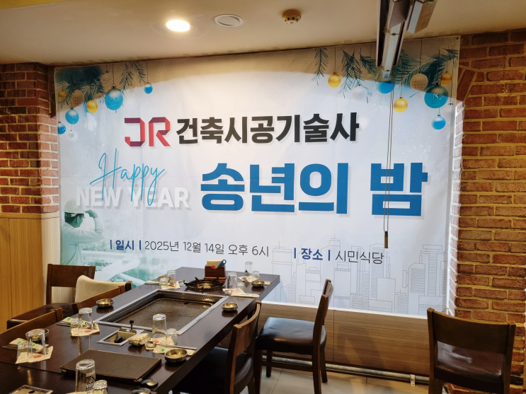 한해를 마무리하는 2025 송년의밤 안녕하세요 종로기술사학원 홍반장입니다 종로기술사학원은 건축시공기술사 합격생들로 지속적인 커뮤니티를 형성하고 소통하고 있는데요 이번에 연말을 맞아 2025 건축시공기술사 송년의 밤을 보냈습니다 2025년 다양한 일이 많았는데요 2025년을 마무리하면서 건축시공기술사 송년의밤을 보냈습니다 뜻깊은 의미가 있는 자리인 송년의밤 이번년도에 합격하신분들 지난 회차에서 합격하신분들까지 다양한 회차에서 합격하신분들이 모였습니다 건축시공기술사의 합격이라는 치열한 과정을 거쳐온 동료 기술사 분들이 한자리에 모여서 서로의 근황토크 그리고 내년의 계획을 알리고 응원하는 시간을 가졌습니다 합....... <img src="https://blogthumb.pstatic.net/MjAyNTEyMTlfMTA4/MDAxNzY2MTE5MDE4MzUw.rRkKm8Sy9nQA7jm0y6wc9vbFhxSGD63S5gVqOVB96Dcg.aKUbQ0I6iN0pOluDjgIH5dkPg6fcXchma2K7-4khaucg.PNG/image.png?type=s3" />