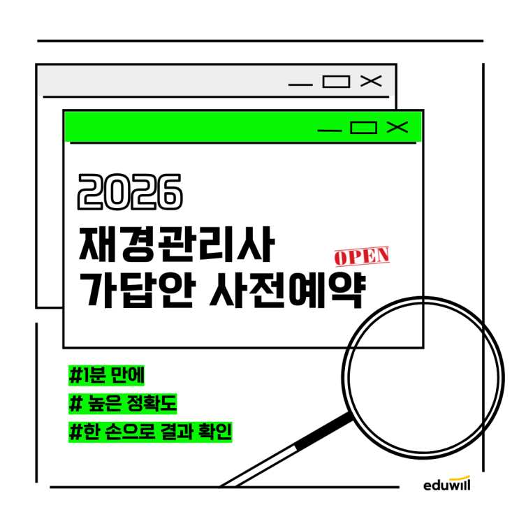 안녕하세요! 에듀윌입니다. 2026년 재경관리사 자격증 취득을 목표로 열심히 달리고 계신 수험생 여러분 공부는 잘 되어가고 계신가요? 많은 수험생분들이 합격을 향해 열심히 노력하고 계실 것이라 예상됩니다. 그래서 오늘은 재경관리사 합격을 위해 꼭! 챙겨야 할 3가지를 소개해 드리려고 합니다! 이에 더해, 시험이 끝나자마자 내 점수를 1분 만에 확인할 수 있는 에듀윌 가답안 서비스 사전예약도 함께 안내해 드리오니 놓치지 말고 모든 혜택받아보세요! 아울러 재경관리사, 회계관리1급, 회계관리2급 시험 일정을 정리해 보았습니다. 일정을 잘 체크하시어, 원서접수를 놓치지 마세요! ★ [2026년 재경관리사 시험 일정표] 제....... <img src="https://blogthumb.pstatic.net/MjAyNjAxMTVfOTAg/MDAxNzY4NDQyOTE1ODMx.XyYKsW2cnW1BioKQUmG_cfgs7Lf8K7vm9XQhVdtS834g.XUzhev1sGugEHZlZUoLuhtWByNFksBQSMqn7iGO_vpQg.PNG/1.png?type=s3" />