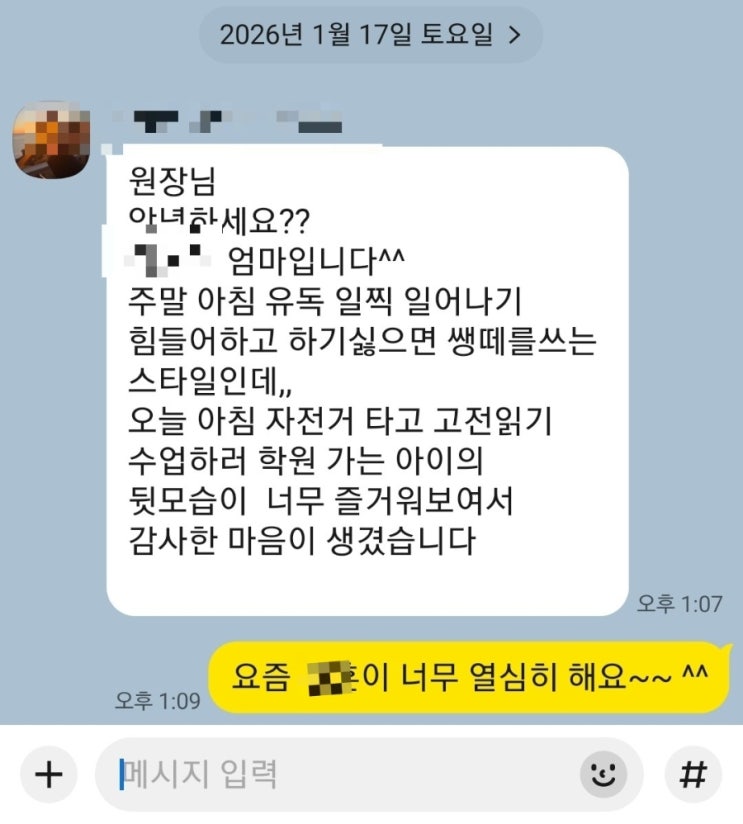 작고 소중한 유아 클래스입니다:) 오늘 유아 클래스 첫날이라 모두 긴장됐겠지만 선생님이 리드하는 대로 잘 따라주는 귀염둥이들^^ 글씨를 읽고 쓰진 못해도 선생님의 즐거운 수업으로 집중력 최고!! 주머니 속 물건 찾아서 맞히기 미션, 친구한테 큰 소리로 좋아하는 놀이 하자고 말하기 미션, 친구에게 축하의 말 건네기 미션 등 차근차근 따라오는 너희가 정말 소중하고 귀하단다:) 선생님과의 친밀감이 조금 쌓인듯하여 한 명씩 앞에 나와서 한마디씩 말하기~^^ 시선, 자세, 입 모양, 소리 등 즐겁게 성장해 나갈 것들이 많지만 앞으로 나온 용기에 큰 박수를 보낸다:) 오늘 즐겁게 참여해 줘서 고마워요♡ 선생님이 정말 마음 다해 성장시....... <img src="https://blogthumb.pstatic.net/MjAyNjAxMTZfMTQx/MDAxNzY4NTc1NDc5NDgy.OUJyZeQIYf3g-ek5QA391hkt_sACQTVliC-GxtvHKq0g.dYzsgO0vefXShs9twSA_kPSpWn4F6IA-zOVX2gLA6g8g.JPEG/900%A3%DF20260116%A3%DF172140.jpg?type=s3" />