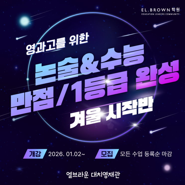 영과고를 위한 논술&수능 만점/1등급 완성 겨울 시작반 ★ 고효율 영과고 맞춤 수업으로 짧은 기간에 25수능에서 각 과목 “만점자” 다수 배출!! ★ 성공적인 대학 입시의 나침판!! 엘브라운에서 함께합니다. ★ 영과고생의 특화된 수능 맟춤 수업!! 소수 정원, 철저한 관리!! ★ 냉철한 분석으로 수능&논술 한방에 방향을 잡자!! ★ 대치동 유일무이 영과고 대상 수능 및 입시 10년차 따라올 수 없는 노하우 ♥ 수강 신청하기 ※ 과목별 정원제로 진행 예정이며, 등록 순 마감합니다. ※ 수강신청 하신분은 따로 안하셔도 됩니다 ※ 개강일은 일정에 따라 변경될 수 있습니다. ■ 국어☆ 김재홍T ,장창현T, 김민찬T, 등 √ 결과로 증명....... <img src="https://blogthumb.pstatic.net/MjAyNTEyMTZfMjkg/MDAxNzY1ODExNzkwNDQz.-WXvNn0oV0Jf5f1rqYmZMp6vUCB8J8CFlN05DEBUoDIg.ZXwGrbfoSxnn6rVnDL1GAoCXTNjd03jgSNAeFxMq6FEg.PNG/%BF%B5%B0%FA%B0%ED_%B0%DC%BF%EF%BD%C3%C0%DB%B9%DD.png?type=s3" />