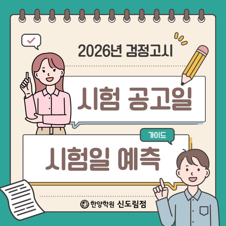 안녕하세요! 한양학원 신도림점입니다~ 오늘은 2026년 검정고시 시험 공고일과 시험일이 언제인지 함께 예측해보고, 검정고시를 어떤 방법으로 준비하는게 좋을지 같이 알아볼게요 ^^ 최근 5년간 검정고시 일정 정리 ➡ 1회 검정고시 공고는 매년 2월 첫째 주 금요일~그 주 화요일 사이에 게시 ➡ 시험일은 4월 첫째 토요일~둘째 토요일 최근 패턴을 기준으로 예측한 일정입니다. (※ 공식 발표는 교육청 공고 후 확정) 2026년 1회 검정고시 예상 일정 26년 4월 첫째 토요일이 4/4 이므로 가장 가능성 높음 ➡ 2회 검정고시 공고는 6월 둘째 주 화~금 ➡ 시험은 8월 둘째 주 화~목 2026년 2회 검정고시 예상 일정 최근....... <img src="https://blogthumb.pstatic.net/MjAyNTEyMTZfMiAg/MDAxNzY1ODQ5ODk4NzI0.z-P2kaHkWl97ly-OvUEPKvwaF9ox5vvoOHUzFc3jEZcg.pklJApJa7DIvigUSyJr885DiOxtPzpMtmMeCOtFb_csg.JPEG/%BD%C3%C7%E8%B0%F8%B0%ED_1.jpg?type=s3" />