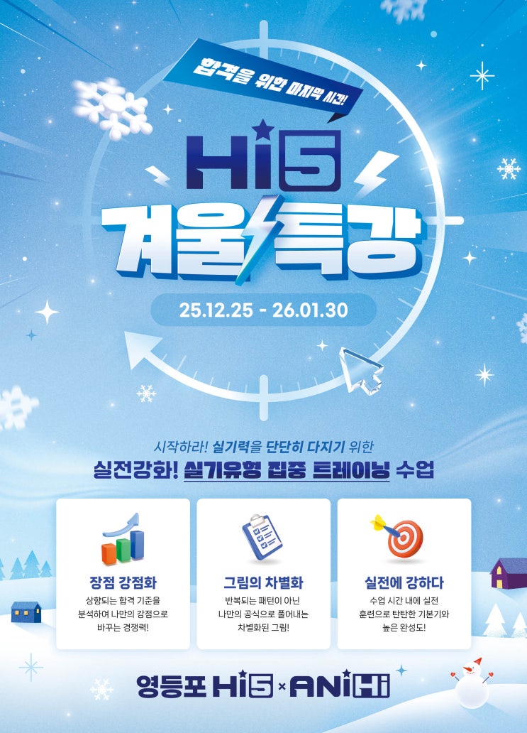 안녕하세요~! 영등포 Hi5(하이파이브) & AniHi(애니하이) 미술 학원입니다. 다가오는 2026년 겨울방학, 추운 날씨 속에서도 아이들이 따뜻한 열정으로 실력을 키울 수 있도록 방학 기간에만 진행되는 겨울방학 특강 프로그램을 준비했습니다. 겨울방학 동안에는 낮 시간 수업이 특강으로 확대 운영되며, 학부모님과 학생들이 한눈에 확인하실 수 있도록 전체 특강 시간표를 이미지로 안내드립니다. 초·중등 전문미술관 1~2월 시간표 안내 ✔ 요일별 / 시간대별로 한눈에 확인 가능 ✔ 방학 기간에만 운영되는 오전·이른 오후 특강 포함 ✔ 정규 수업과 특강 시간 구분 표기 각 특강은 반별 최소 인원 충족 시 개설되며, 수업별 세부 내....... <img src="https://blogthumb.pstatic.net/MjAyNTEyMThfMjM1/MDAxNzY2MDQwNzQyNDY0.HN22Abvmc7t9vWTwEWODz6SxgQpTX_A5i1hnprR7Y4Yg.6urjEIlf5bk-0oFpgzhNhkj4Fw45BDL2l_Tcav8lV9gg.JPEG/KakaoTalk_20251126_123919816_06.jpg?type=s3" />